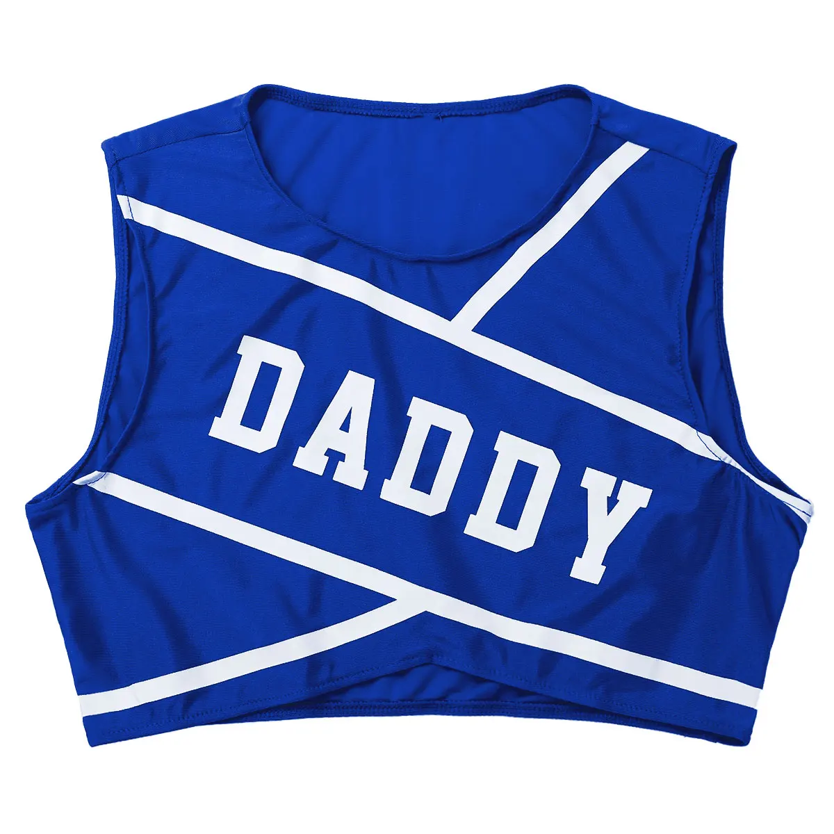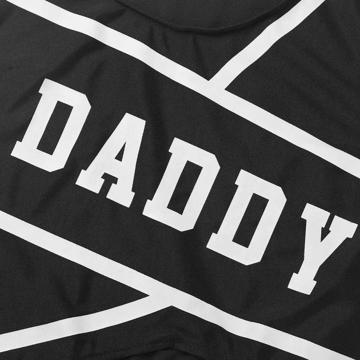 Укороченный топ без рукавов с круглым вырезом и надписью «DADDY» спереди; Эластичная плиссированная мини-юбка.
