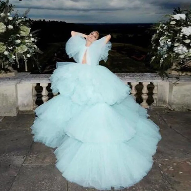 Красивые длинные платья из тюля небесно-голубого цвета для беременн...