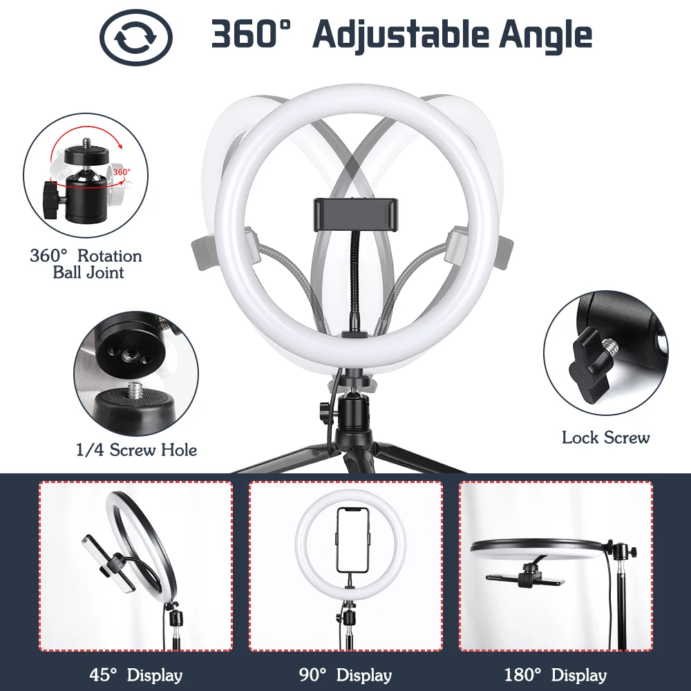 Складной кольцевой светильник для селфи и светильник на 360 °. Дизайн: уникальный складной кольцевой светильник, удобно положить в сумку или багаж. Портативный, чтобы взять везде, как открытый прямой эфир и путешествия. По сравнению с другими светильник штатив на рынке, он обеспечивает 360 ° площадь светильник ing после складывания кольцевой светильник при использовании, которая является универсальные и еще более неотразимой.