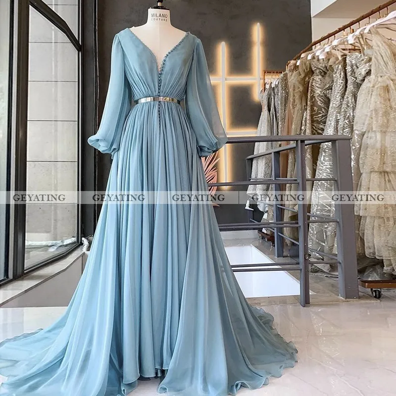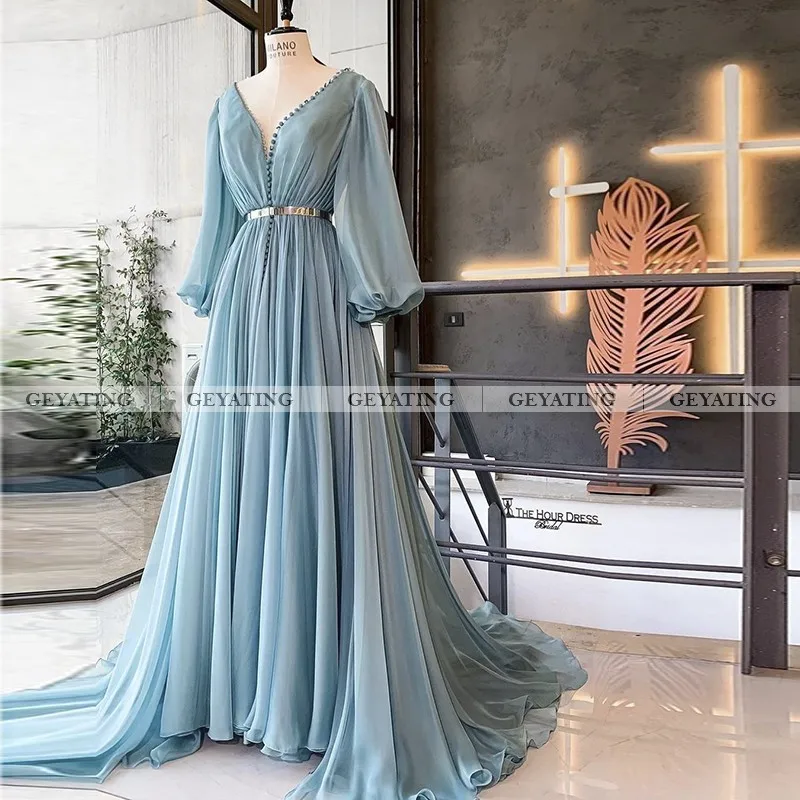 Элегантные мятно-зеленые арабские вечерние платья с длинным рукавом...