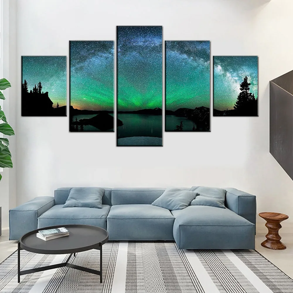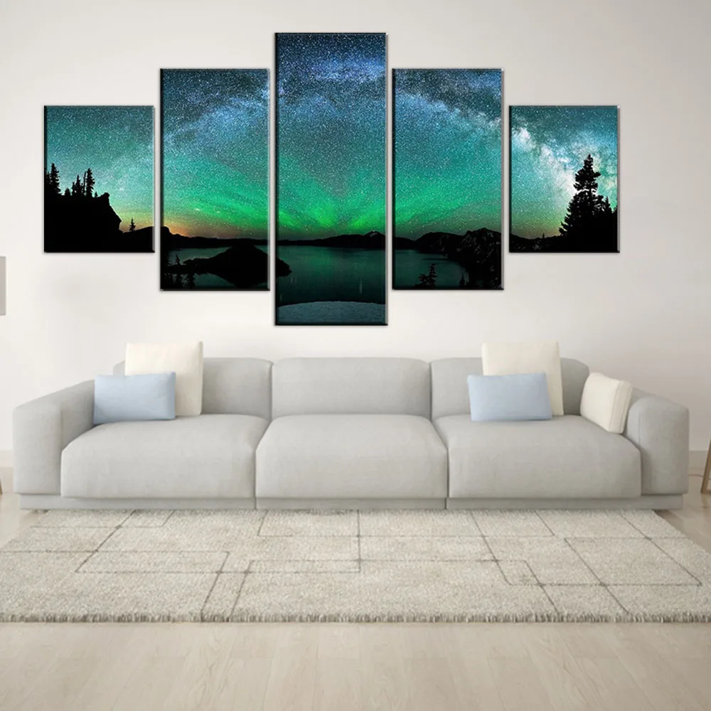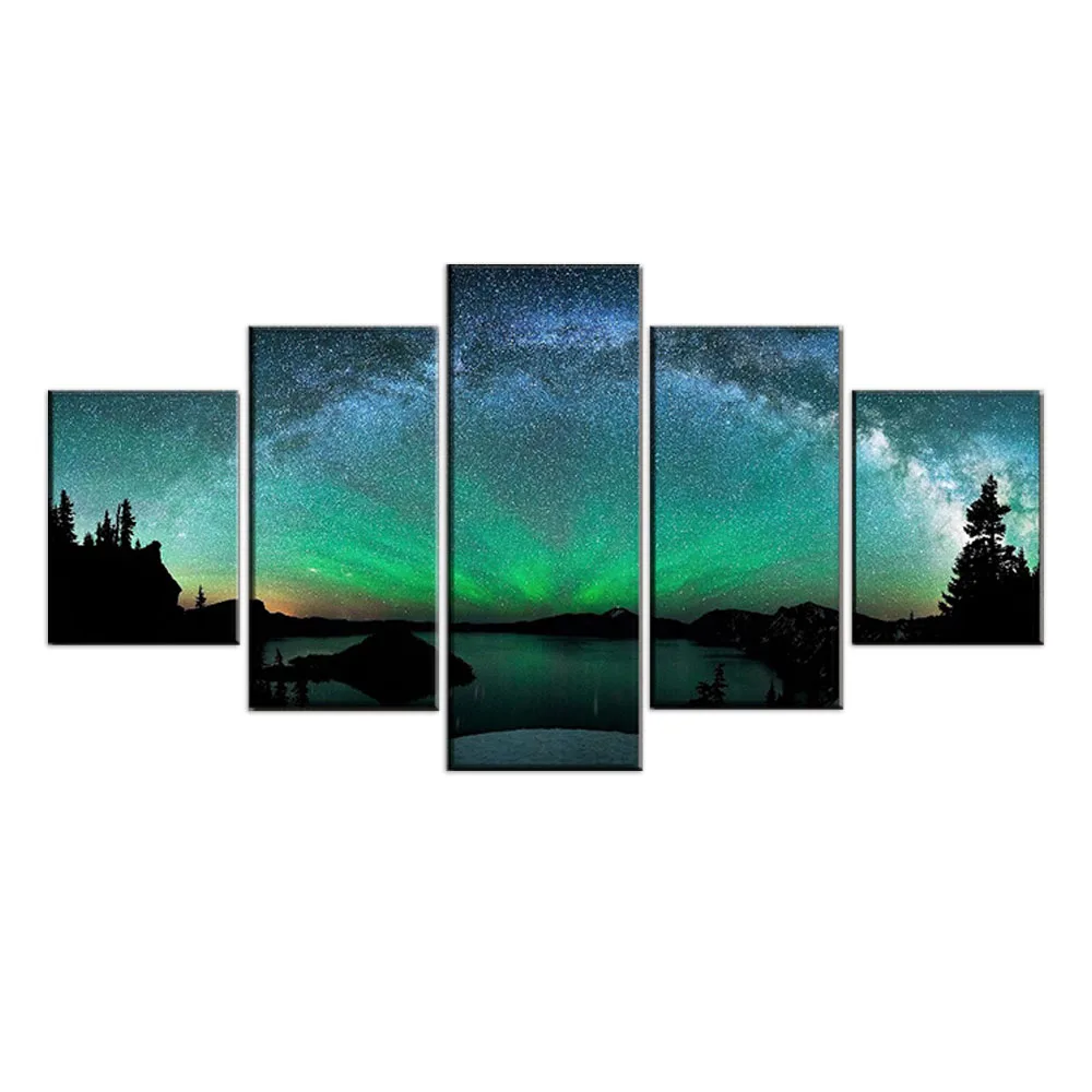 Холст, настенное искусство, домашний декор, плакат, каркасная печать, картина, 5 панелей, Аврора борелис над зимним озером, пейзаж, картина