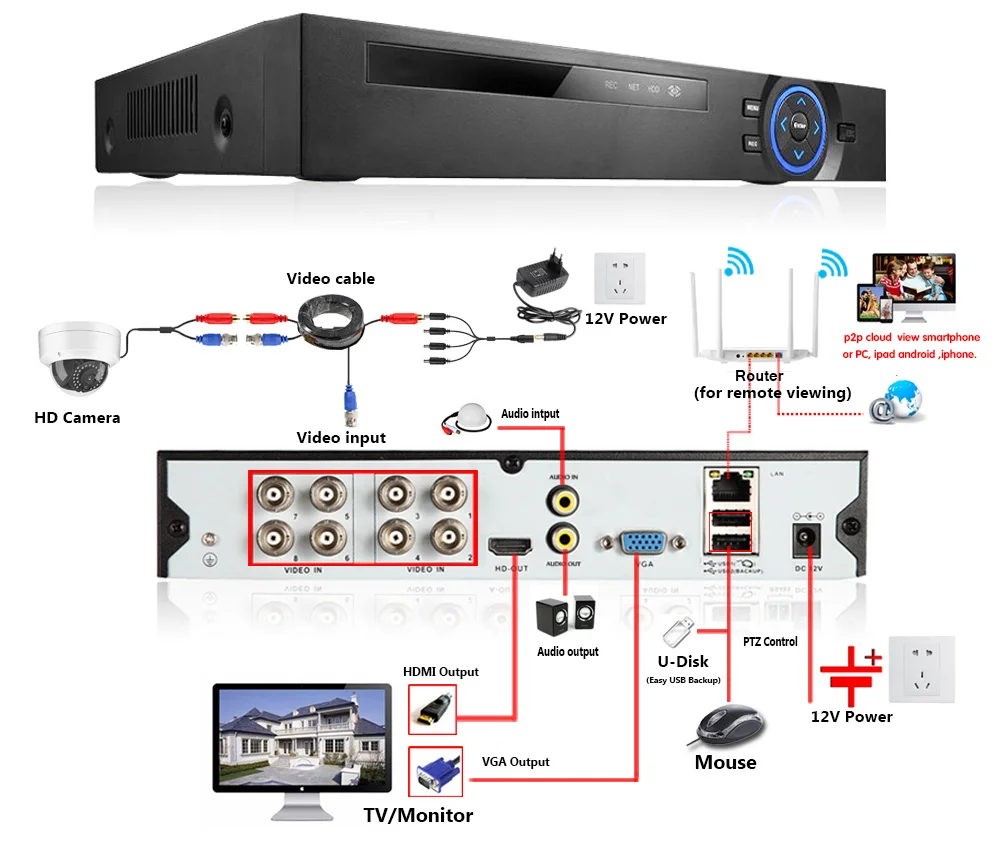 Простая настройка, всего 4 шага для просмотра мобильный телефон, просмотра видео в режиме реального времени из любого места и в любое время с помощью смартфона, стола или ПК с передовой технологией P2P, вы можете получить удаленный доступ к вашей системе за считанные минуты или меньше, нет необходимости в переадресации, удаленный доступ никогда не был таким простым