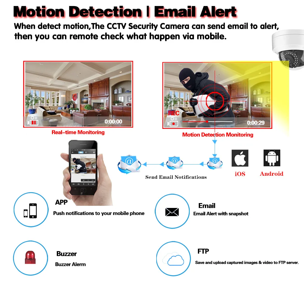 Можно настроить область, которую вы хотите контролировать, когда она срабатывает, она отправит сообщение на вашу электронную почту, вы можете получить информацию из первых рук, независимо от того, когда и где вы находитесь.