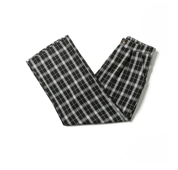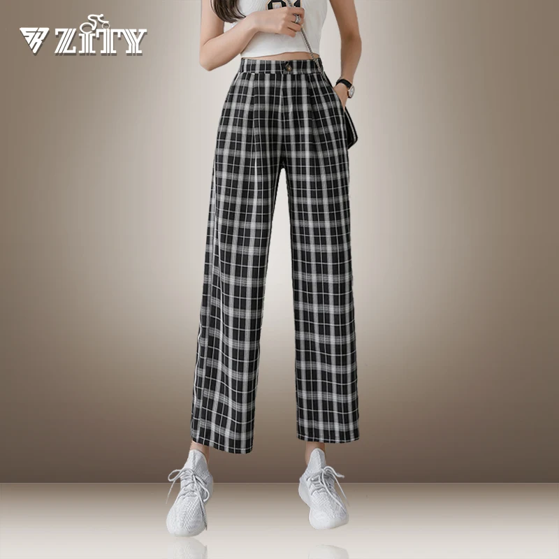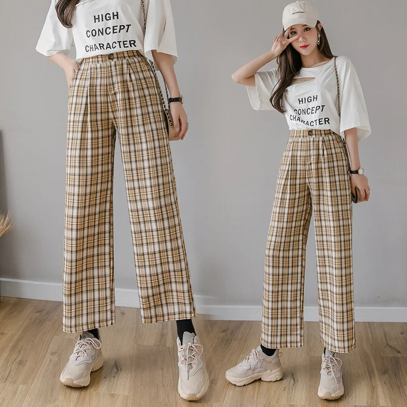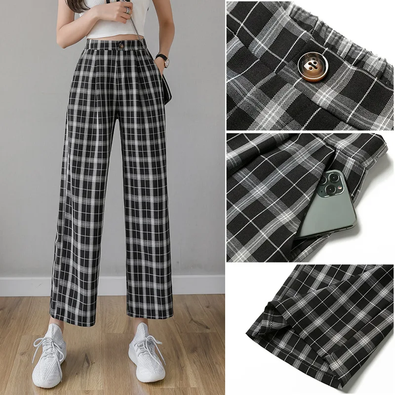 Женские винтажные брюки с эластичной резинкой на талии, клетчатые брюки для женщин с высокой талией размера плюс, широкие брюки, повседневные женские корейские брюки для женщин