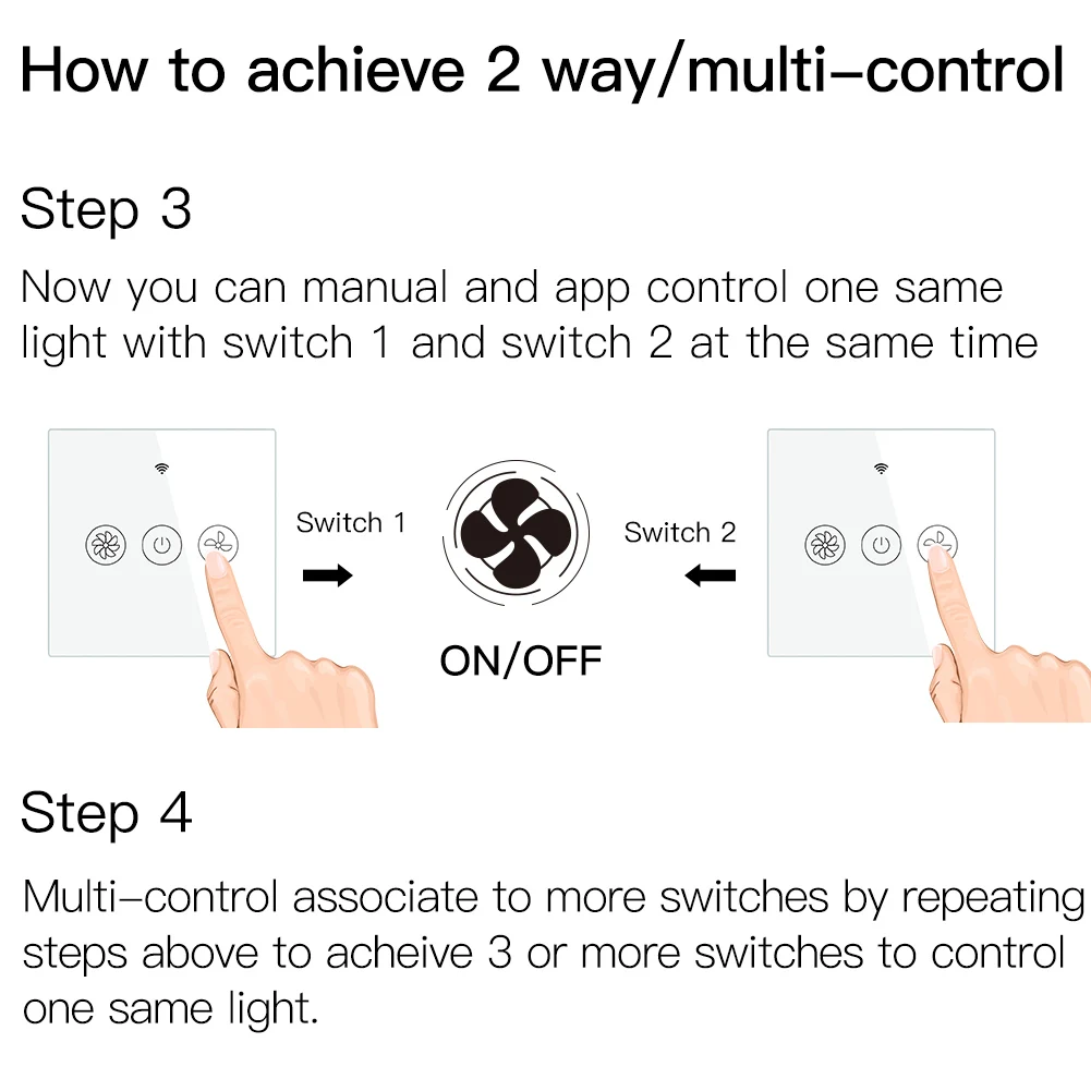 1,2/3-way multi-control association для управления 1 потолочным вентилятором с несколькими переключателями; Панель из закаленного стекла с защитой от царапин подходит для любого домашнего декора и обеспечивает легкое сенсорное управление; вы можете связать этот переключатель с несколькими различными переключателями в приложении Smart Life.2. Режим управления без помех; Позволяет управлять переключателем через умную жизнь, сенсорное управление, голос и пульт дистанционного управления с частотой RF433 и дистанционным переключателем кодирования 1527 (не входит в комплект); каждый метод управления работает независимо; Достичь мульти-контроля, связываясь с другими смарт-переключателями3. Совместимость с Alexa и Google Home для голосового управления без рук; Также можно управлять через приложение Smart Life/Tuya в любое время и в любом месте; Настройка статуса реле и запоминание последнего статуса реле опционально при выключении питания, включение/выключение подсветки.4. Возьмите полный контроль за подключенными приборами с таймером, расписанием и обратным отсчетом (1/5/30 минут, 1 час и т. д.) с приложением; Поделитесь контролем с семьей и друзьями для дополнительного удобства5. Нейтральный провод требуется в вашем воздушными выключателями коробки переключателей правильной работы; Поддерживает только 2,4 ГГц сети; Предлагает легче сопряжения через подключение по Wi-Fi и Bluetooth; включает в себя полную 2-годовая гарантия и 60 дней гарантия возврата денег для полного удовлетворения.