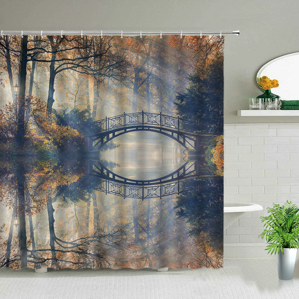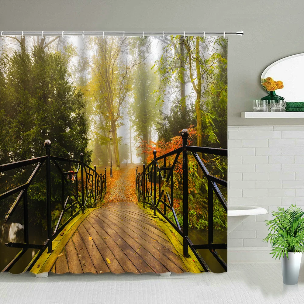 Занавеска для душа с изображением природного пейзажа, деревянного моста, водопада, весенний пейзаж, зеленый лес, 3d, водонепроницаемая, горячая распродажа