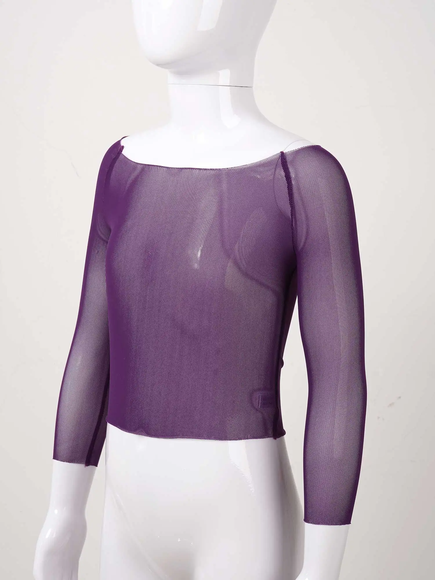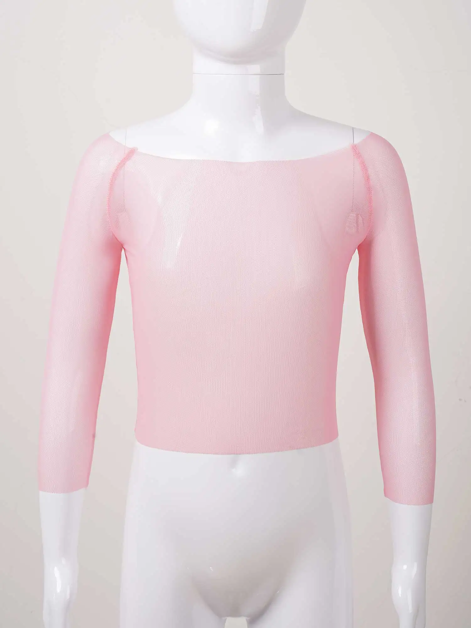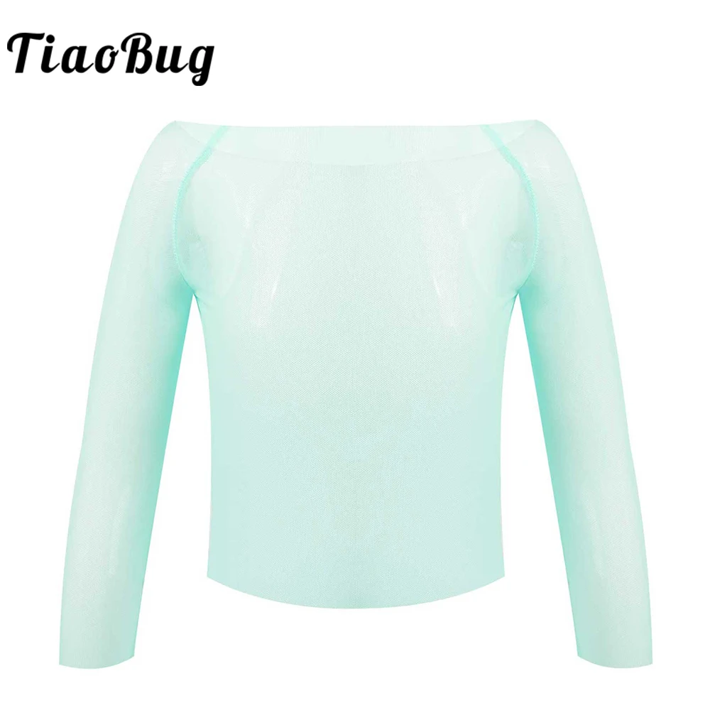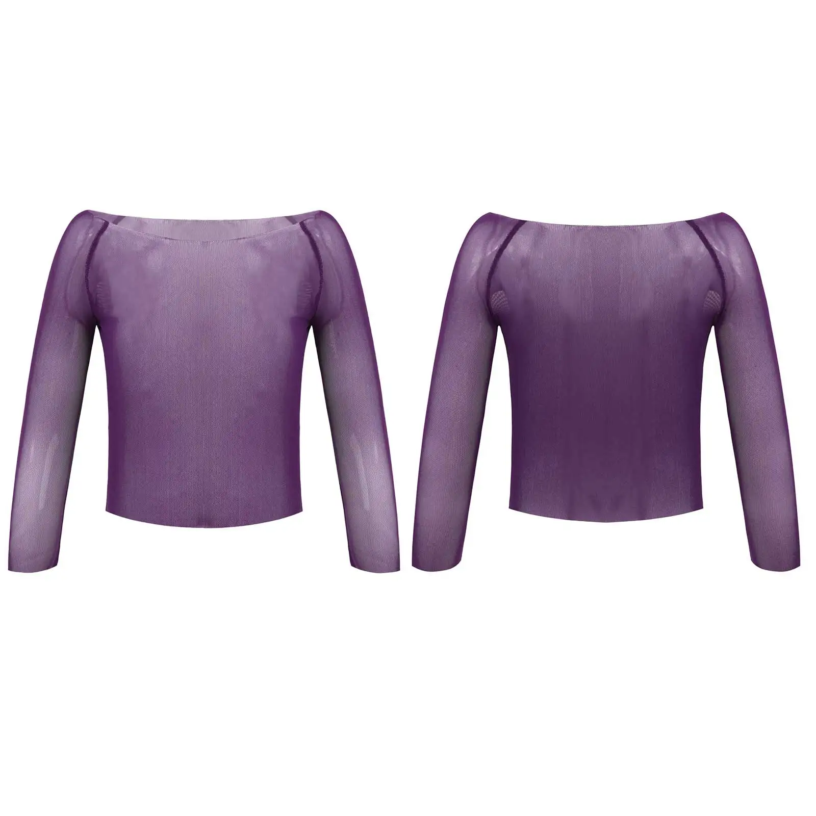 Топы для танцев, Женская Сетчатая футболка для балета, йоги, балерины с длинным рукавом и открытыми плечами, прозрачная балетная блузка, топы, танцевальная одежда для девочек