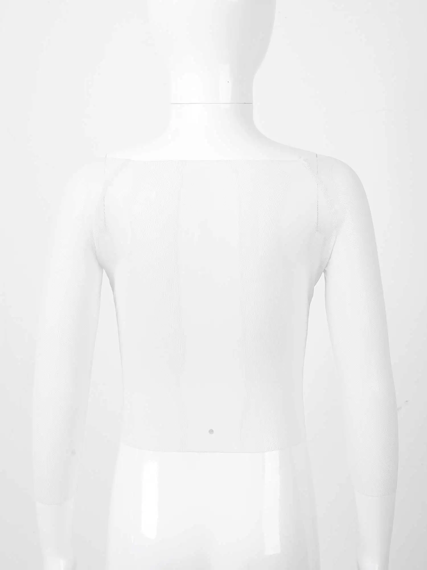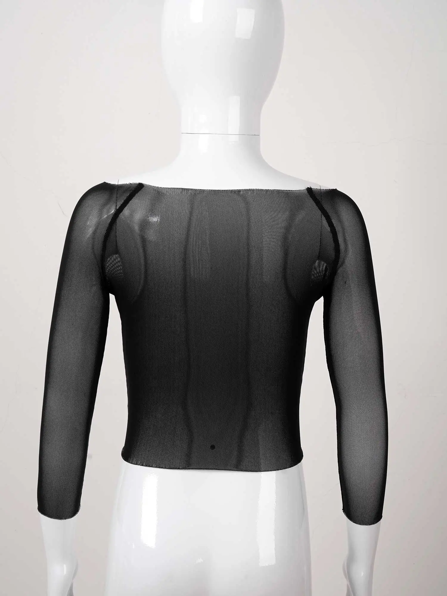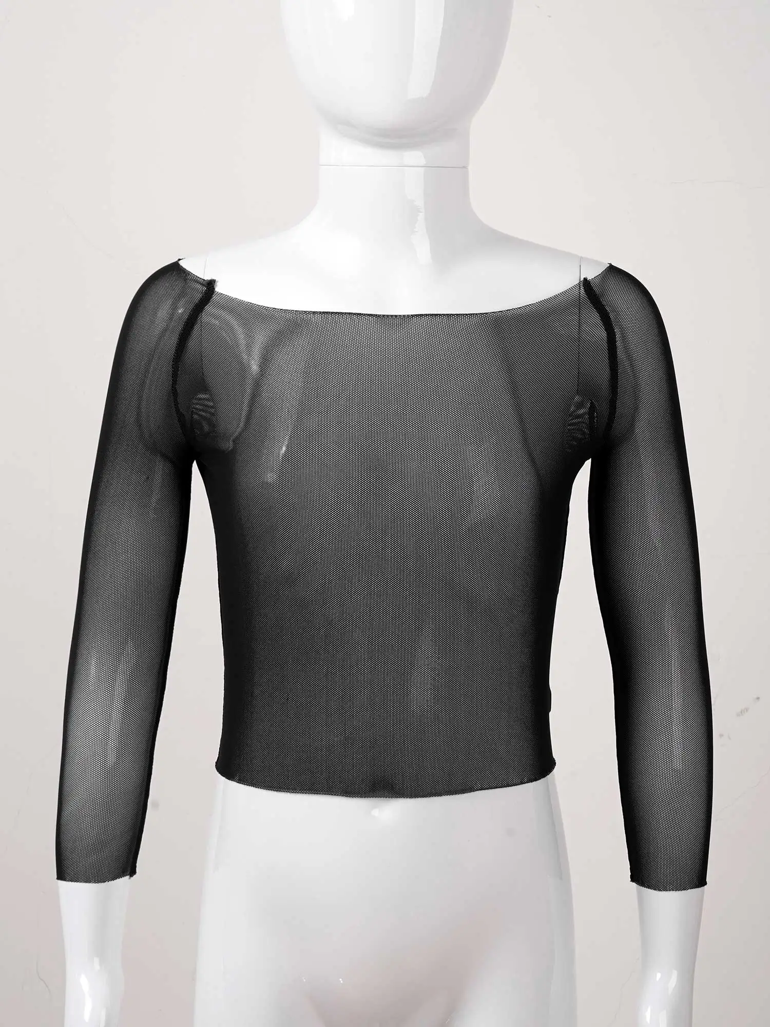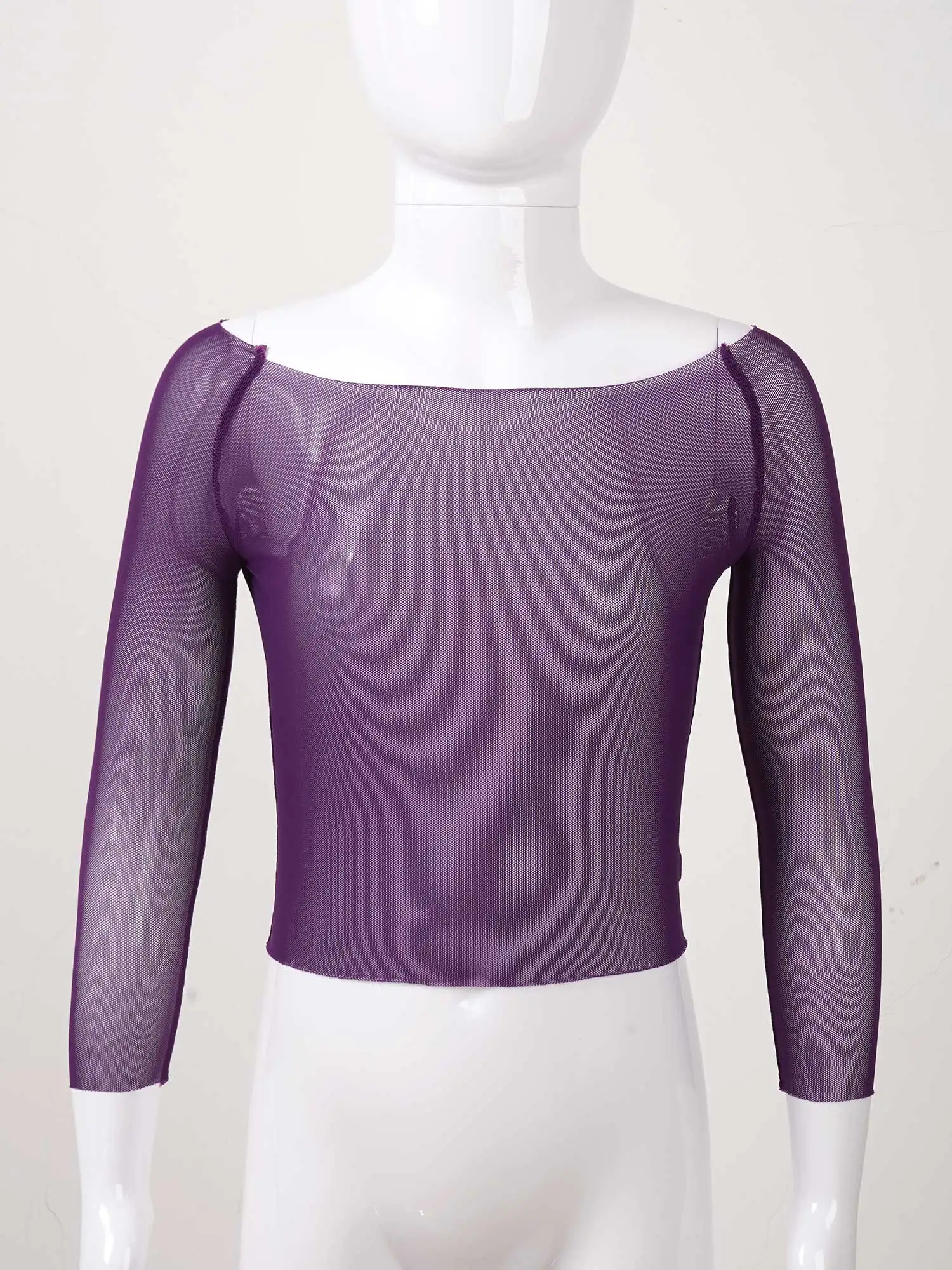 Топы для танцев, Женская Сетчатая футболка для балета, йоги, балерины с длинным рукавом и открытыми плечами, прозрачная балетная блузка, топы, танцевальная одежда для девочек