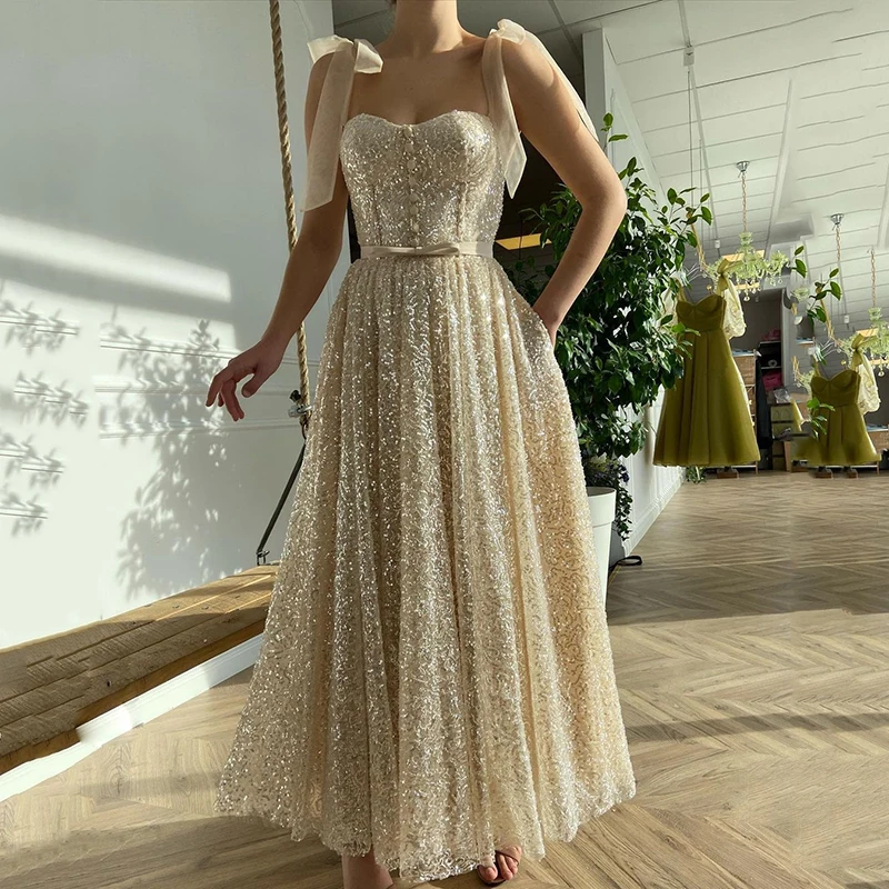 Длинное платье цвета шампанского UZN, элегантное праздничное платье на бретельках с блестками и кружевом, на шнуровке, арабский вечер
