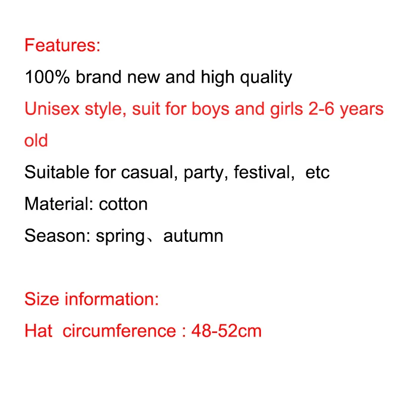 Особенности:100% новый и высокое качествоСтиль унисекс; Костюм для мальчиков и девочек 2-6ЛетПодходит для повседневной носки, вечерние, фестивальные и т. Д.