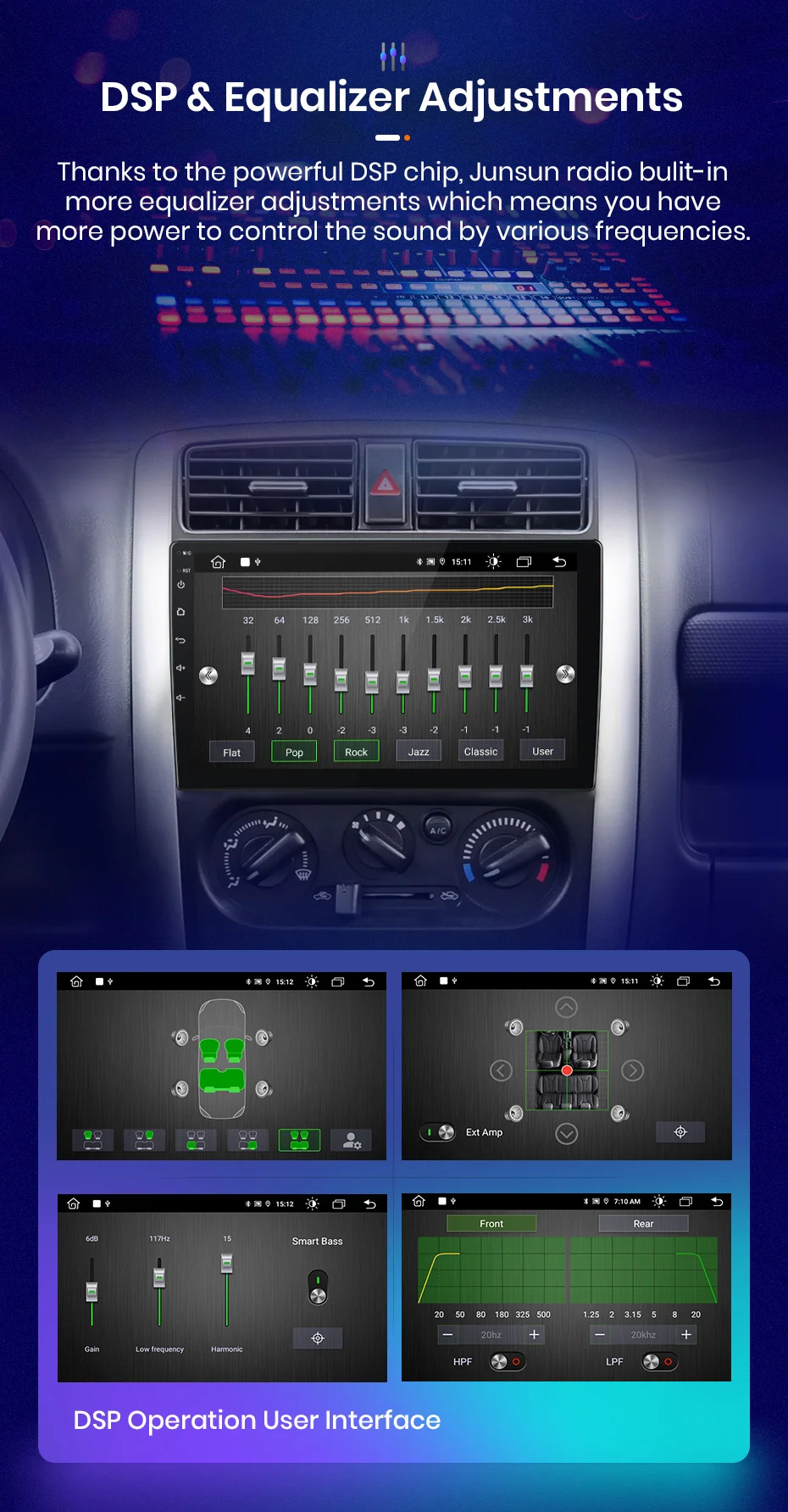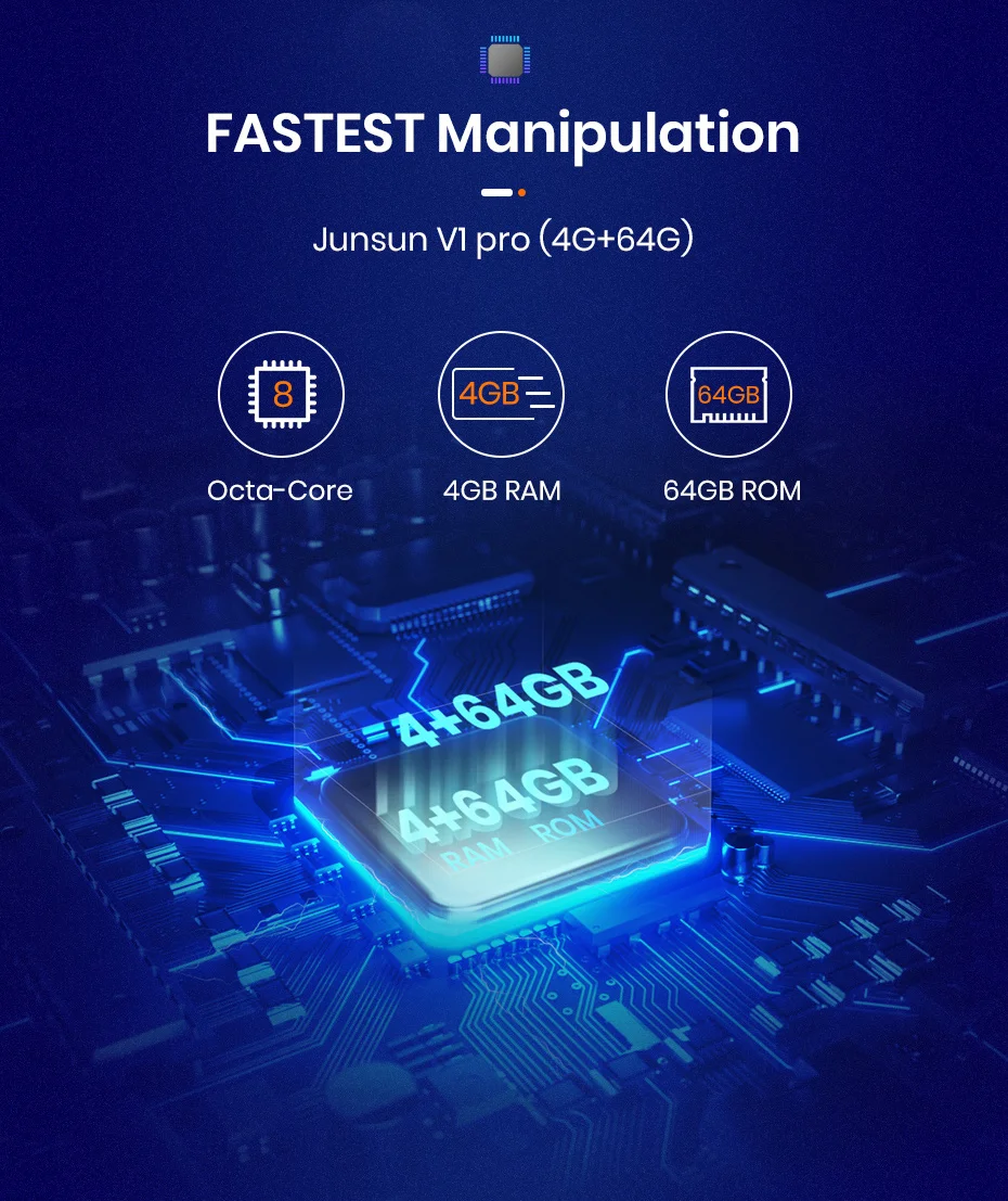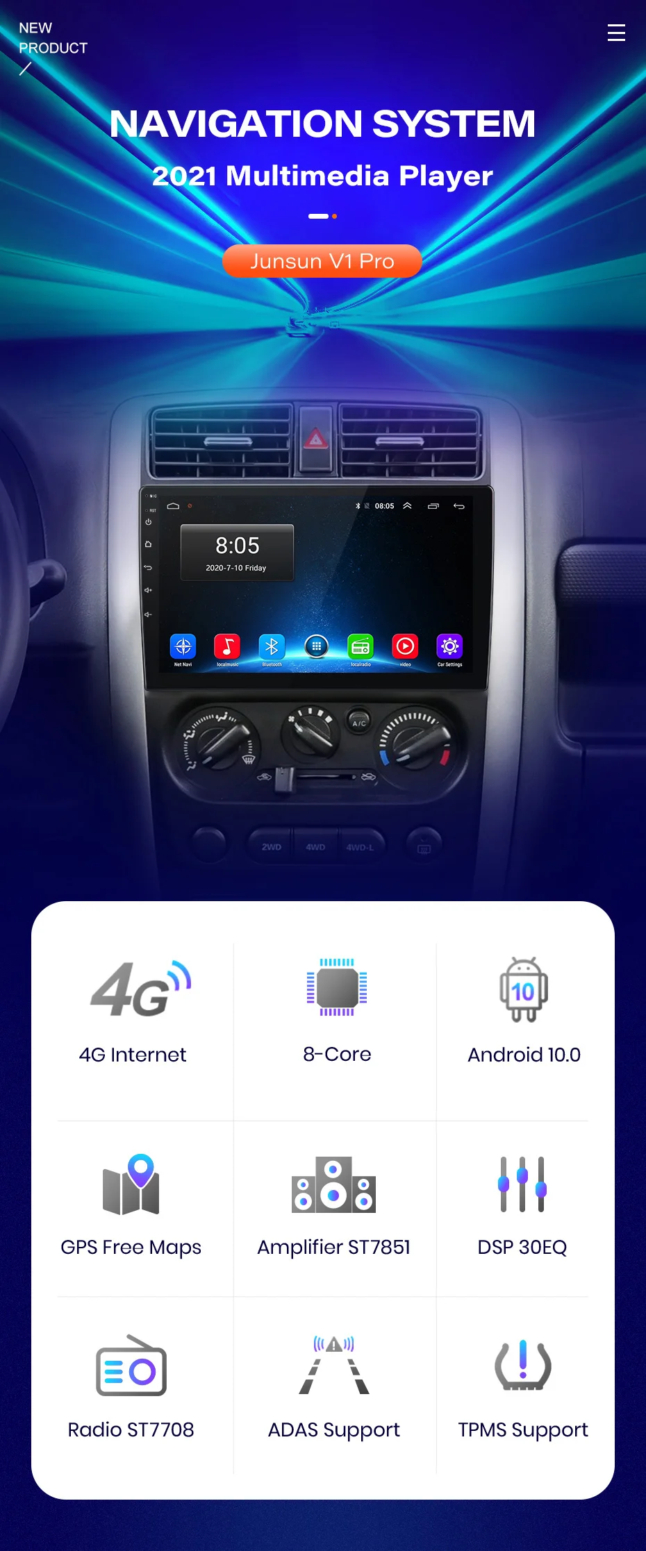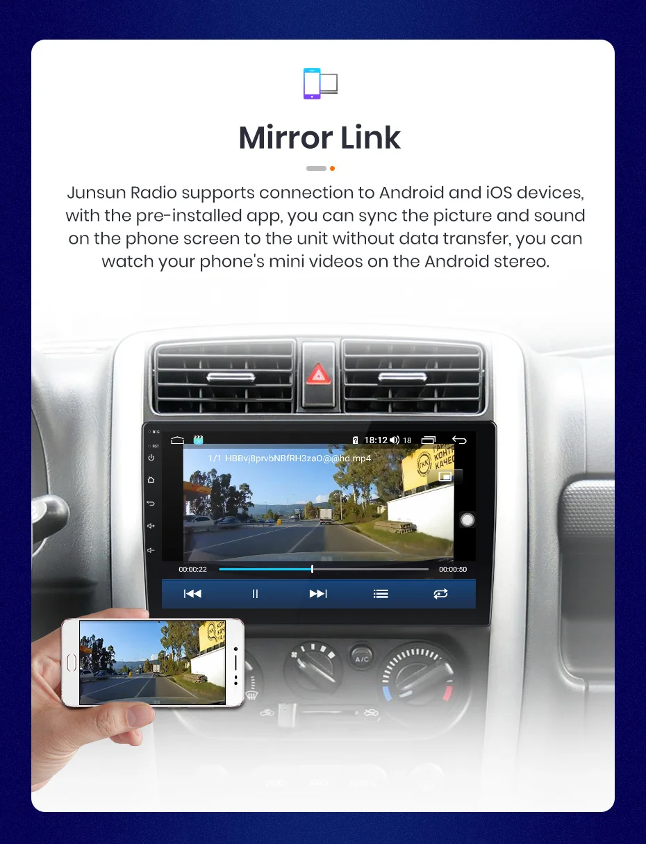 9 дюймов 2.5D емкостный Экран + 4 ядра 1,2 ГГц Процессор + DDR3 1 Гб (2 Гб опционально) Flash + 16 Гб памяти (32 Гб опционально) + Встроенный Wi-Fi модуль (подключается к сети 4G опционально) + gps-навигация (бесплатное обновление карты, только Поддержка бренда Junsun) + управление рулевым колесом + зеркальная связь + Bluetooth + Встроенный микрофон + FM/AM + RDS (опционально) + Поддержка USB ADAS DVR Функция + Европейская DAB функция + 1080P Vedio Play + HD 1024*600 + Система контроля давления в шинах> OSD языкРусский, английский, испанский, итальянский, французский, чешский, арабский, немецкий, иврит, китайский, эстонский, польский, филиппинский, финский, корейский, голландский, хорватский, латышский, литовский, румынский, норвежский, португальский, японский, шведский, тайский, турецкий, украинский, венгерский, словацкий, датский, словенский.> 24H * 7 поддержка обслуживанияВ Junsun Наша цель-продолжать усердно работать, чтобы сделать инновационное оборудование и программное обеспечение автомобильного мультимедийного плеера радио, чтобы дать вам этот индивидуальный опыт.Мы предоставляем обновления для прошивки, программного обеспечения, gps-навигационных карт бесплатно.