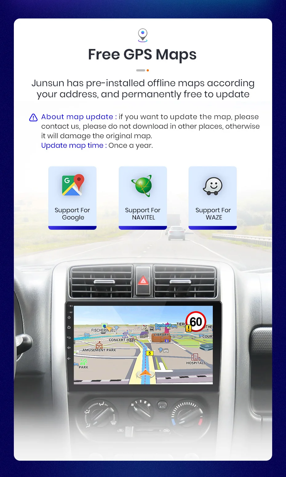 Junsun имеет предварительно установленные офлайн карты и постоянно свободно обновляется> Об установке карт:Поддержка карты Европы/Северной Америки/Южной Америки/Юго-Восточной Азии/Ближнего Востока (мы установим карту по вашему адресу, например: Россия, мы установим карту России)> Об обновлении карты:Если вы хотите обновить карту, пожалуйста, свяжитесь с нами, мы загрузим ее в «Drop box», пожалуйста, не загружайте в других местах, в противном случае это повредит оригинальную карту.Обновление карты: один раз в год