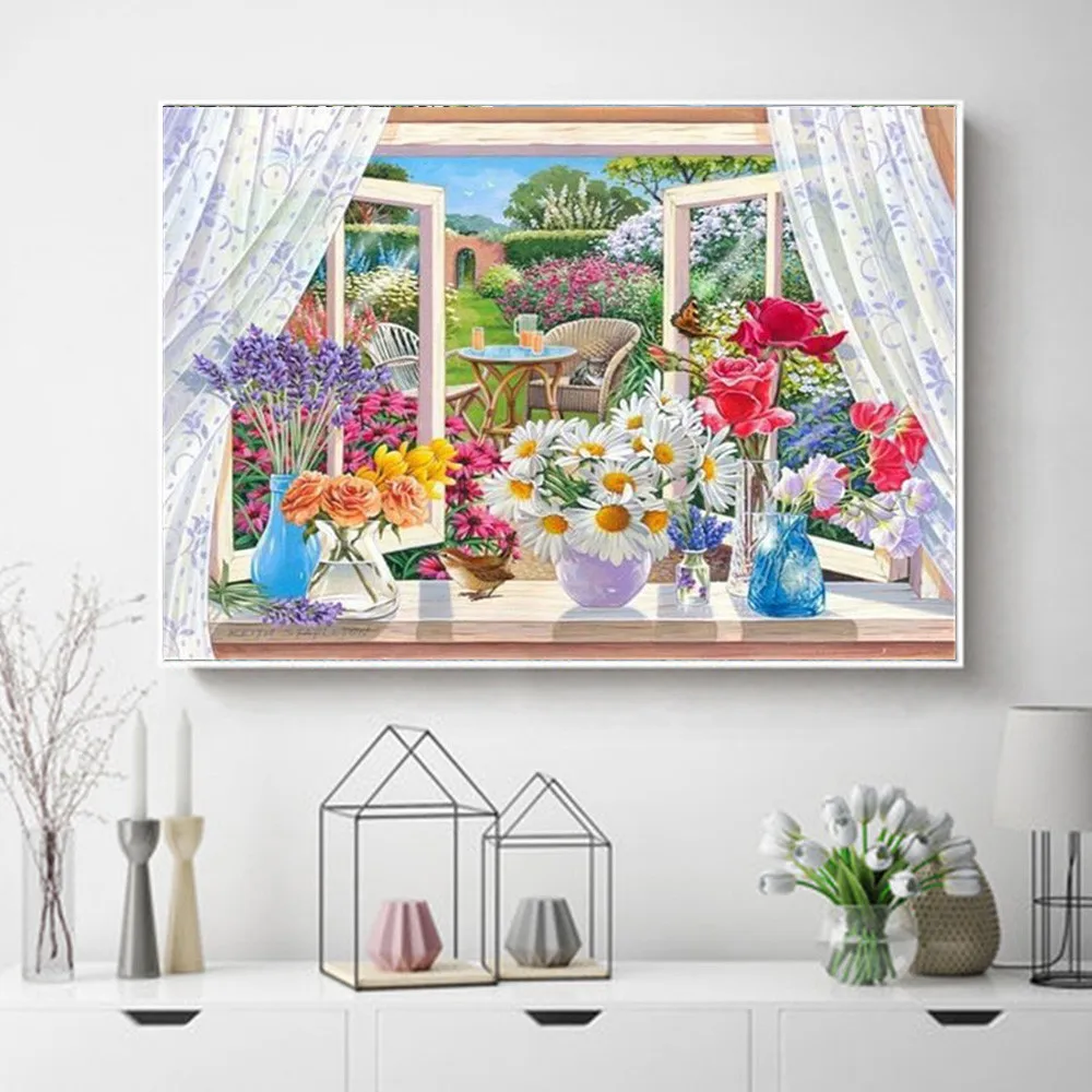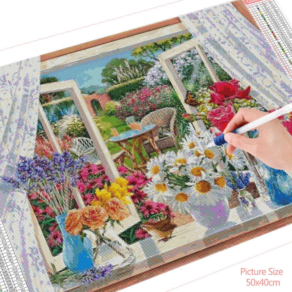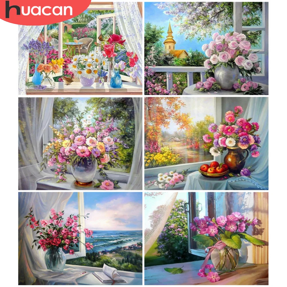 Алмазная живопись HUACAN с цветами, вышивка крестиком, украшение на стену, Алмазная мозаика с окном, пейзаж, подарок ручной работы