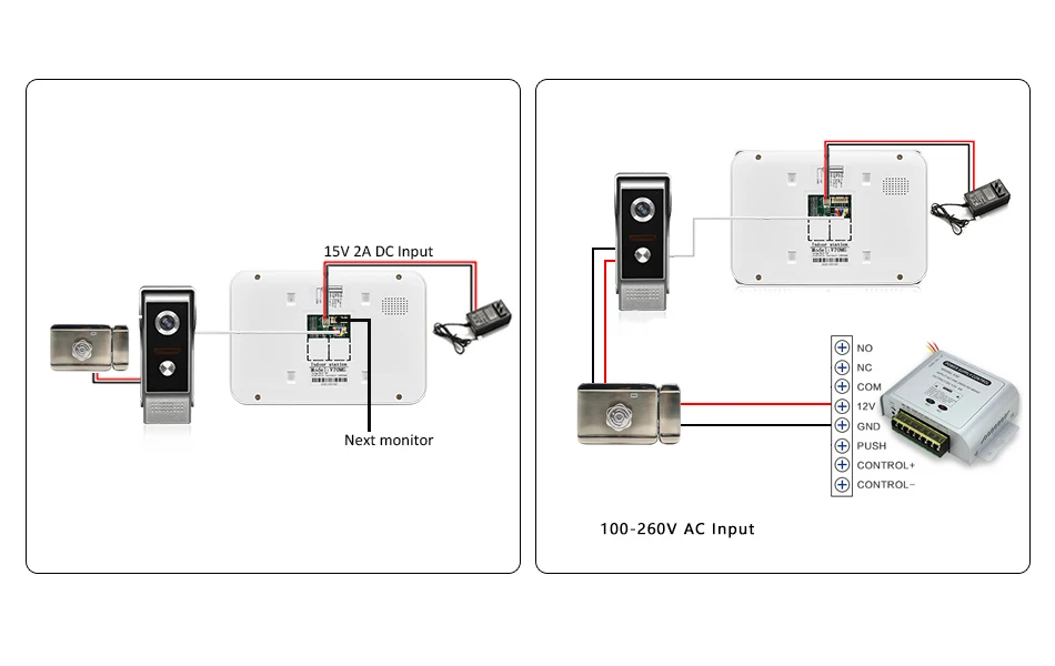 Этот видеодомофон может подключаться к электрическому замку. Вы можете открыть дверь с помощью внутреннего монитора. Очень удобно!(Примечание: замок не входит в посылка, необходимо купить дополнительно)