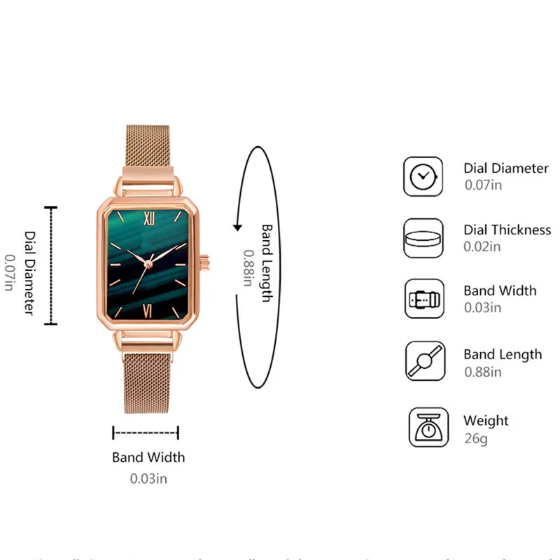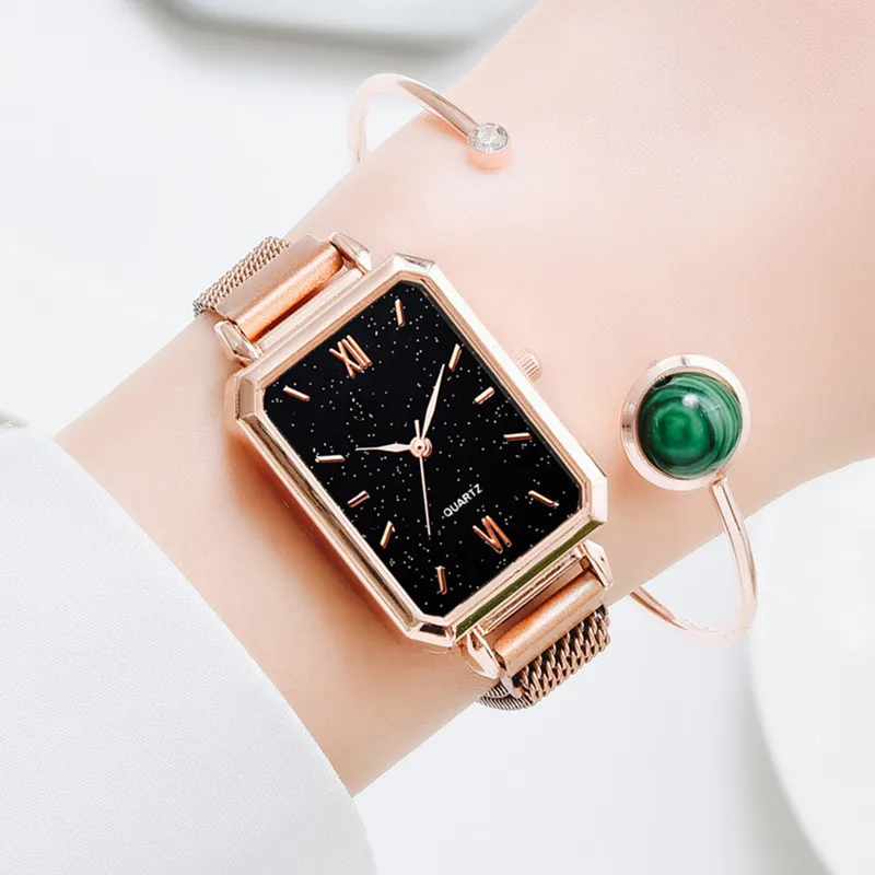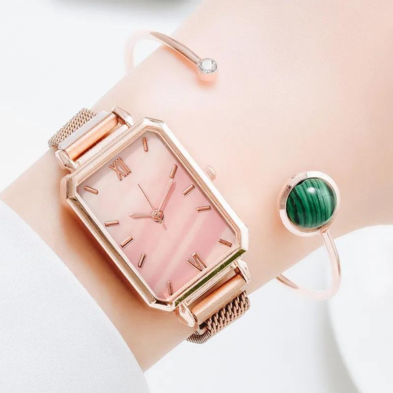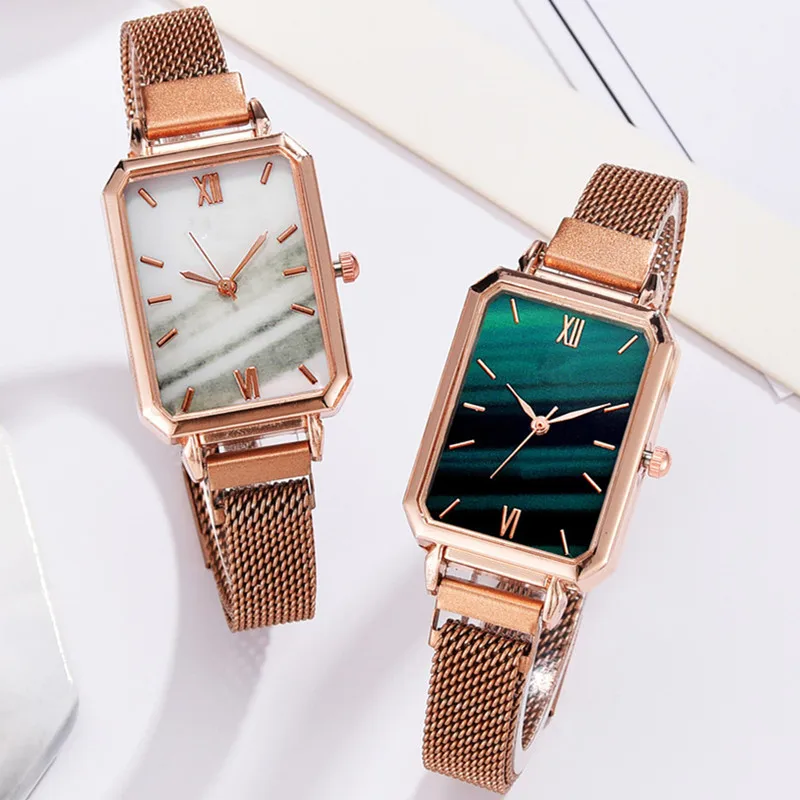 Часы женские кварцевые с квадратным циферблатом, Модный комплект с браслетом, роскошные простые сетчатые часы розового золота с зеленым циферблатом