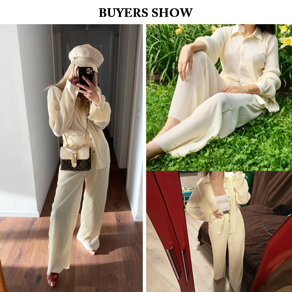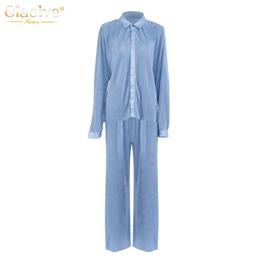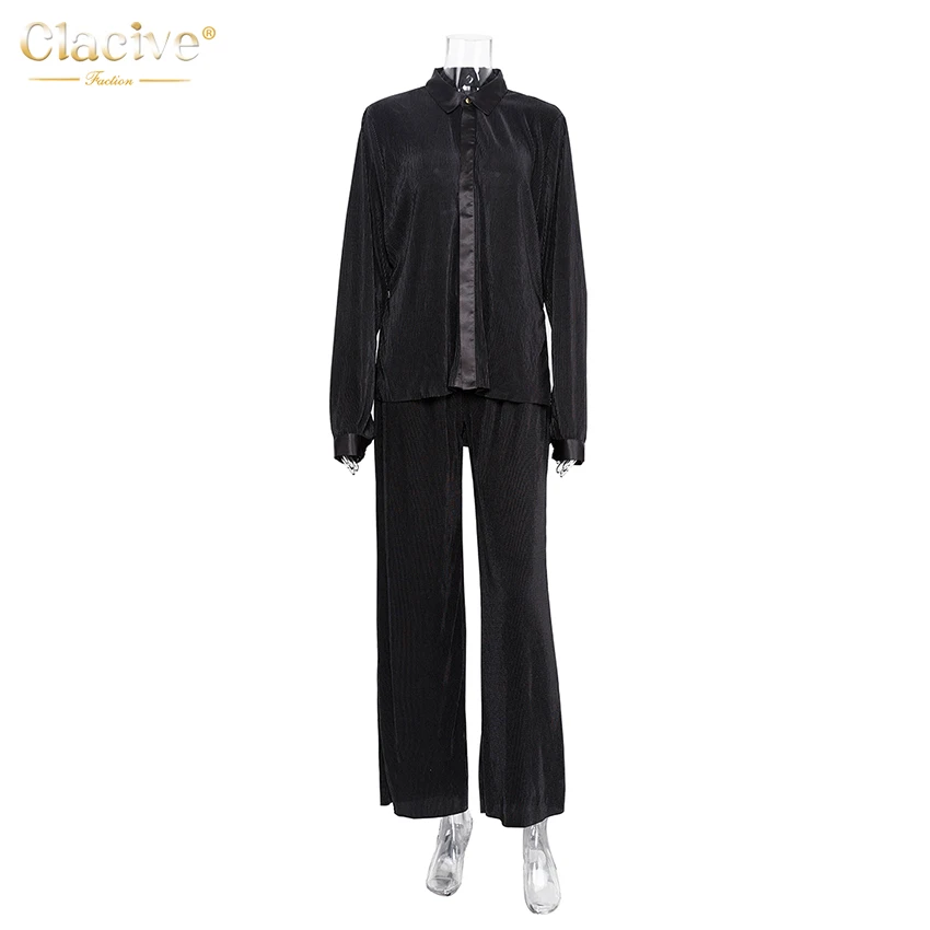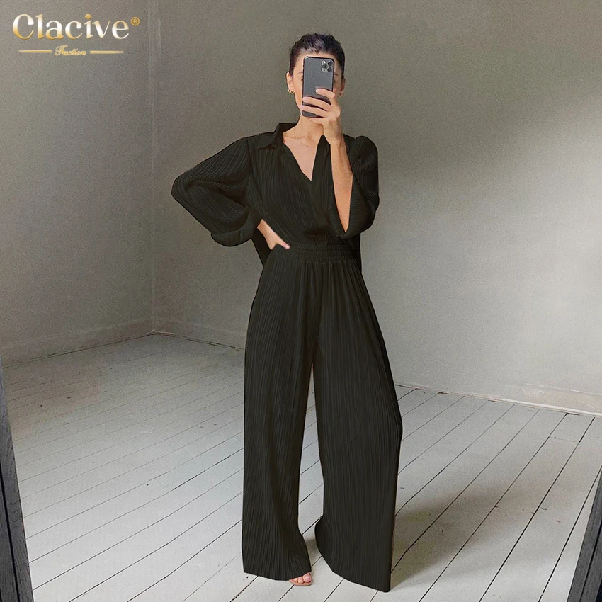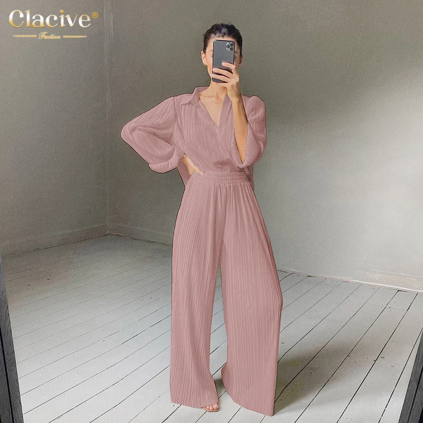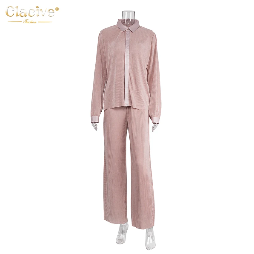 Женский плиссированный домашний комплект Clacive, бежевая Повседневная Блузка с отложным воротником и длинным рукавом, широкие брюки с высокой талией, уличная одежда, 2 шт.