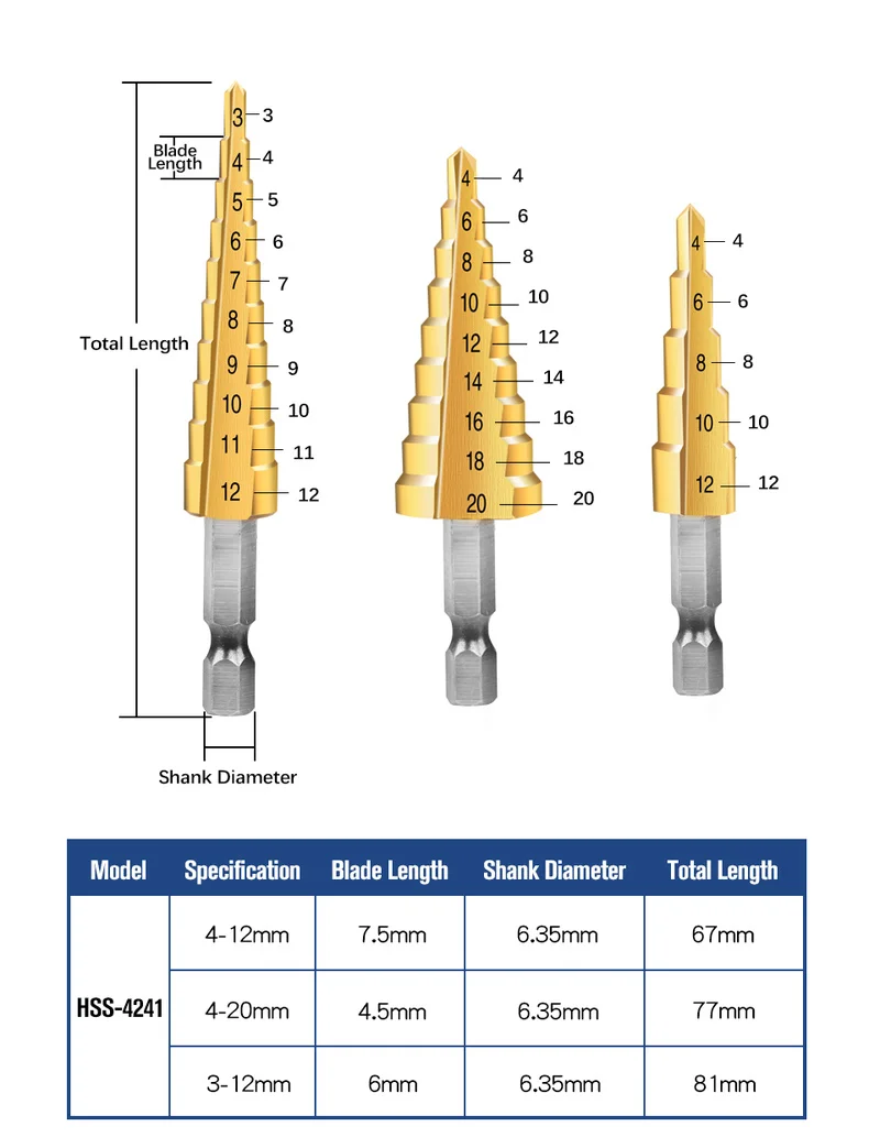 Сверло ступенчатое из быстрорежущей стали, 3 шт.набор, 3-12 мм, 4-12 мм, 4-20 мм