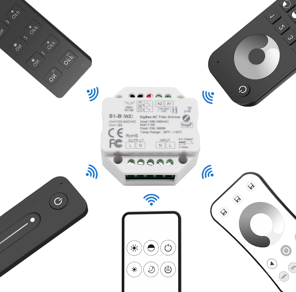 ● Модель: MJJC-S1-B(WZ)● ZigBee + RF + пуш-ап диммер с Отсечкой фазы для сети пер. тока, 1 выходной канал.● Затемнять и включать одноцветные затемнения светодиодный лампы,Традиционные лампы накаливания и галогенные лампы.● Облачное управление Tuya APP, поддержка вкл/выкл, регулировка яркости,Задержка включения/выключения светильник, таймер, сцена и функция воспроизведения музыки.● 256 уровней 0-100% плавное затемнение без вспышки.● Затемнение передних кромок или затемнение задних кромок устанавливается переключателем dip.● Минимальная яркость может быть установлена ключом.● Совместимость с дистанционным управлением RF 2,4G с одной зоной или несколькими зонами затемнения.● Каждый S1-B(WZ) контроллер может также работать как ZigBee-RF постоянного тока в переменный конвертер, затем Используйте приложение Tuya для управления одним или более RF затемнения светодиодный контроллер или драйвер одновременно.● Подключение к внешнему кнопочному переключателю для обеспечения включения/выключения и 0-100% функции затемнения.● Легко помещается в стандартную настенную распределительную коробку позади кнопочного выключателя.● Защита от перегрева/перегрузки, восстановление автоматически. S1-B(WZ) ZigBee & RF AC ТРИАК диммер