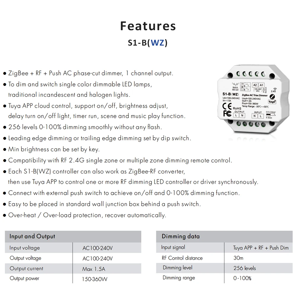Входное напряжение: 100-240 В переменного токаВыходное напряжение: 100-240 В переменного токаВыходной ток: макс. 1,5aВыходная мощность: Макс 360 ВтВходной сигнал: Tuya APP + RF + Push DimДистанция радиочастотного управления: 30 мУровень затемнения: 256 уровнейДиапазон затемнения: 0- 100%