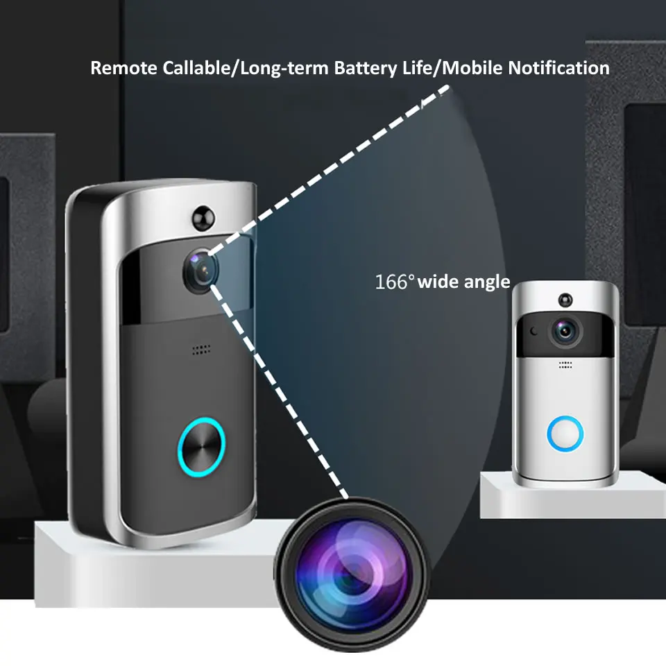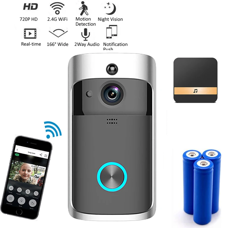 Умный дверной звонок камера Wifi беспроводной звонок Домофон видеоглаз для квартирДверной звонок для телефона домашние камеры видеонаблюденияОсобенности1. Три батареи спецификации 18650.(По вашему выбору, цвет изображения)2. Миллион HD пикселей совмещен с широкоугольным объективом 166 градусов3. Поддержка Мобильный телефон удаленного устройства быстрого пробуждения в течение 1 секунды.4. 2,4G Wi-Fi соединение5. Высококачественный двусторонний разговор с шумоподавлением6. Поддержка пассивного инфракрасного датчика движения, когда кто-то парит у двери, немедленноОповещает о push-уведомлениях на мобильный телефон.7. Автоматическое переключение дневного и ночного режимов, будь то день или ночь, изображениеХорошо заметен, для вашей безопасности и семейной безопасности.ПараметрыОсобенности: беспроводное соединение, сверхнизкое энергопотребление, дистанционное активное пробуждение, быстрая звездаИспользование: гости могут посетить видео, голосовые звонки, и кратковременное видео, режиссеру не нужно открывать дверь, тогда будет знать информацию угловогоРежим пробуждения: кнопка пробуждения дверного звонка, Пассивный инфракрасный датчик пробуждения тела, мобильный телефон активный ПробуждениеСигнал тревоги: Быстрое нажатие за 3-5 секундОнлайн-пользователи: Поддержка нескольких пользователей онлайн-часов одновременноСенсор: Автоматический баланс белого, автоматический контроль усиления, Автоматическая компенсация подсветкиОтношение сигнал-шум: >39 дБНочное видение: Auto ICR, 6 шт. 850nmMil Strongpower инфракрасная лампа, 10 метровРазрешение: 720PTalkback: двусторонний речевой интеркорм, с эхоподавлениемБеспроводная сеть: 802.11b/G/NБезопасность сети Wiress: шифрование безопасности WPSРежим видео: Мобильное видео обнаружения, кнопка дверного звонка триггера видео, ручная запись видеоХранение:7 дней свободного облака, не поддерживает TF-картуРежим питания: питание от батареек, 3 шт. Батареек 18650Мощность: Стандартный ток 400uA, рабочий ток 200mAРабочая среда: Рабочая температура: -10-50 градусов; Рабочая влажность:<95%Способ установки: установка ворот или стенМатериал: ABS пластик + электронный оригинал