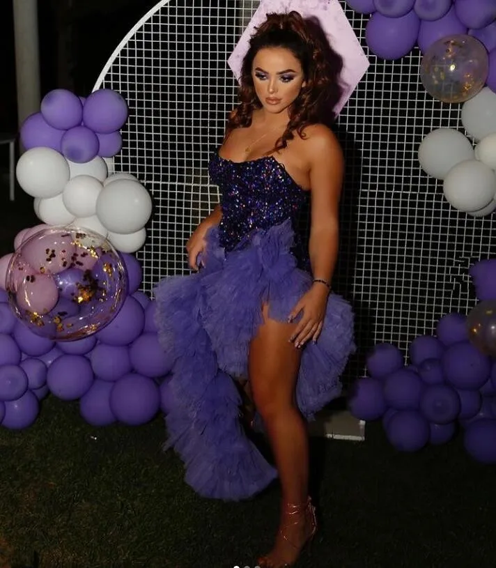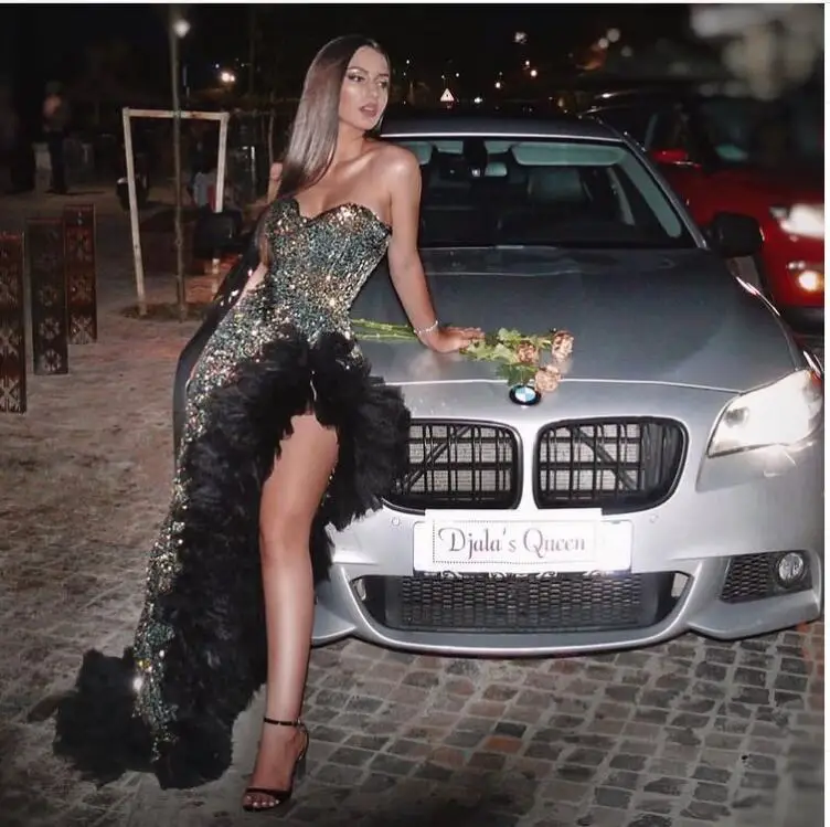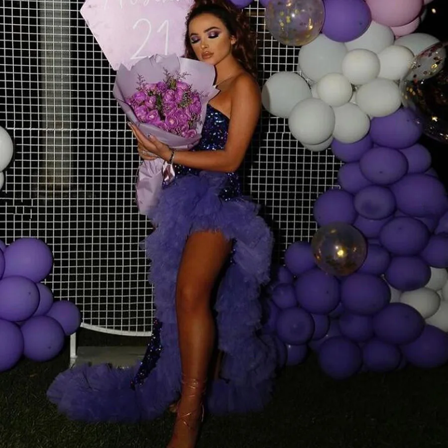 High End Цветной блестками асимметричное пикантные вечерние платья для выпускного Разделение с рюшами Тюль Длинные Для женщин Платья для вечеринок с открытыми плечами платье подружки невесты, бальные платья