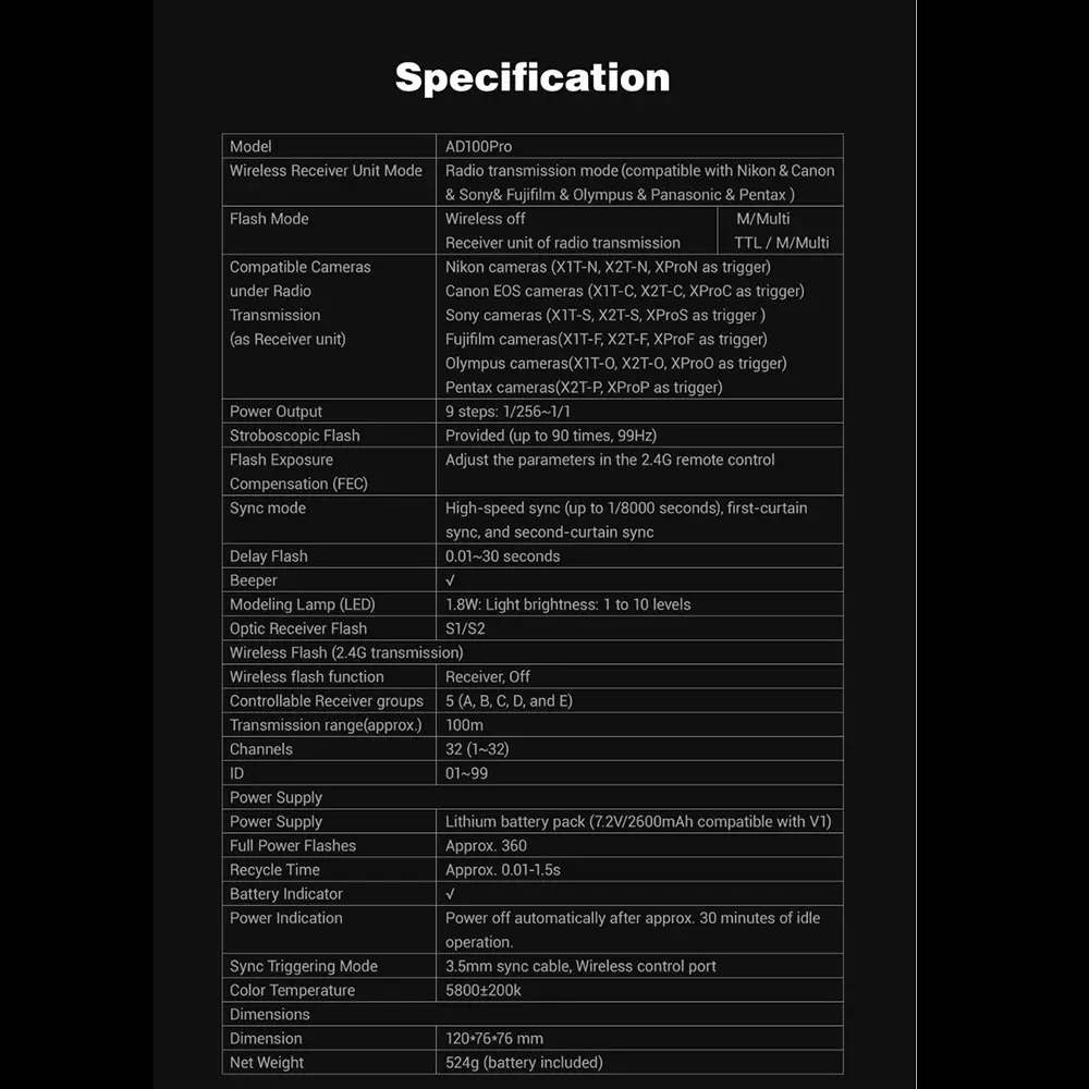 В AD100pro имеет впечатляющие основные функции, такие как 100Ws из Регулировка мощности в девяти шагов от 1/256 до 1/1, многоразовое использование от 0,01 до 1,5 секунд, и короткая вспышка сроки. AD100pro имеет ручную, автоматическую и стробоскопическую возможности. Ручной режим выводит выбор мощности пользователя, моделирующий светильник и синхронизацию первого или второго штор. Мульти режим контролирует стробоскопическую скорость до 90 раз (90 Гц). Дополнительный беспроводные передатчики с 32-канальный и четыре группы системы управления режим вспышки, во-первых, во-вторых высокая скорость синхронизации, Скорость синхронизации до 1/8000, во-вторых, уровень мощности, И моделирующая лампа на расстоянии до 328 '. Обновления прошивки доступны на веб-сайте Godox.