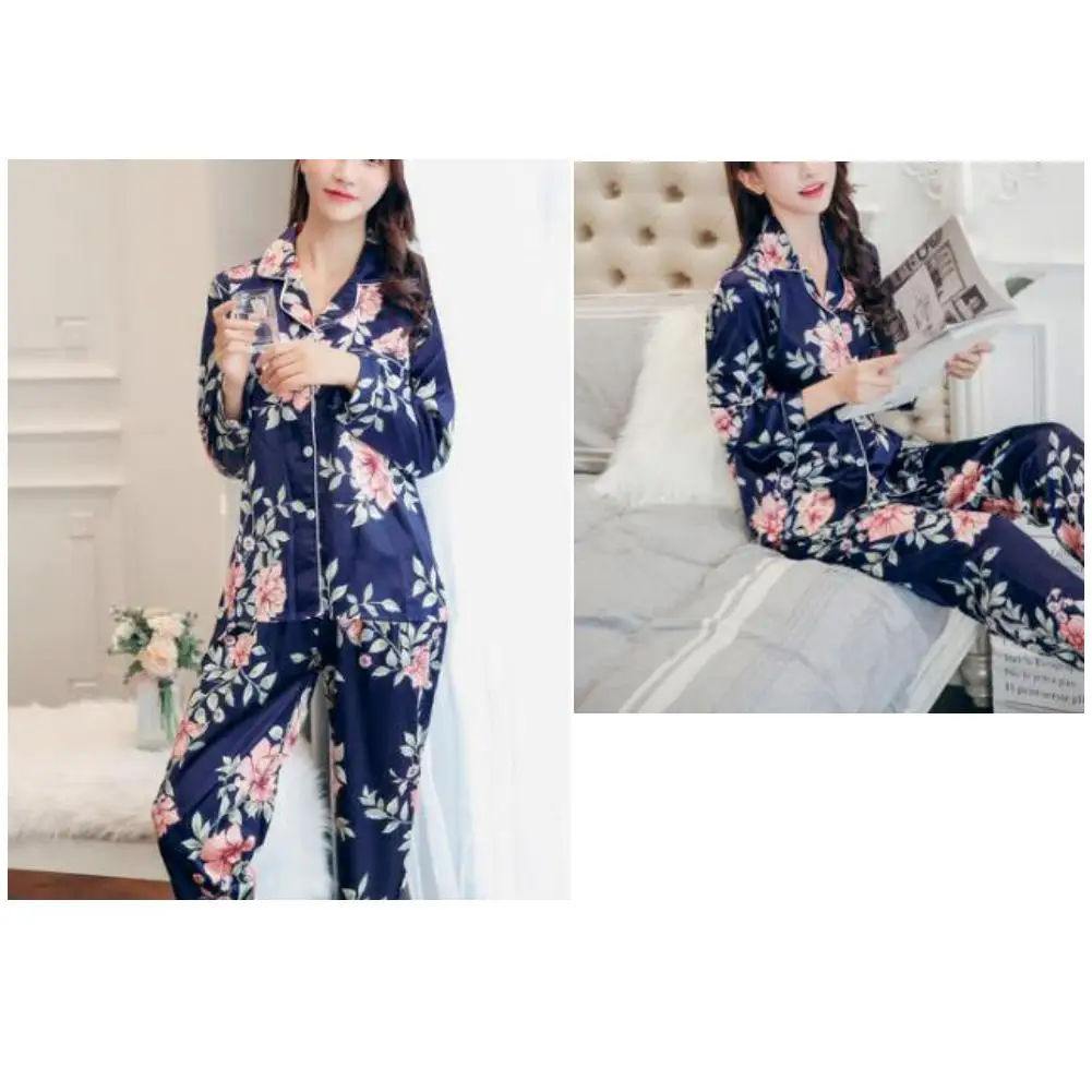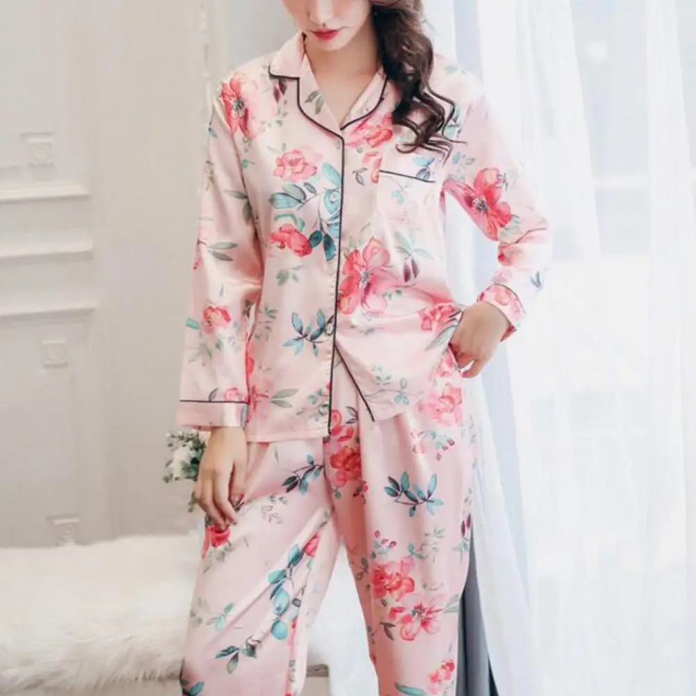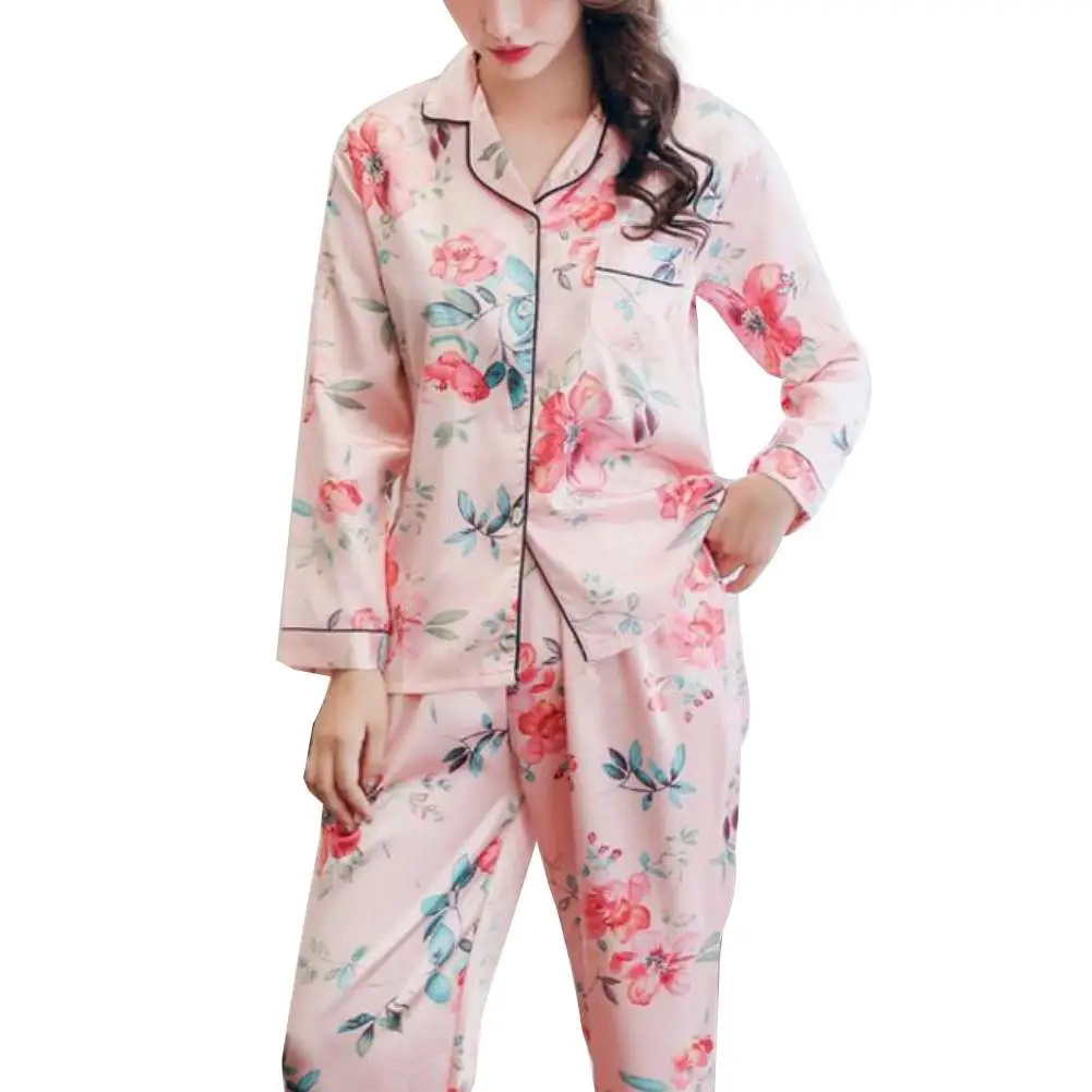 Женский пижамный комплект с цветочным принтом, топ с длинными рукавами и штаны, имитация шелка, ночное белье, пижама, Пижамный костюм, Женская домашняя одежда, Famle, весна