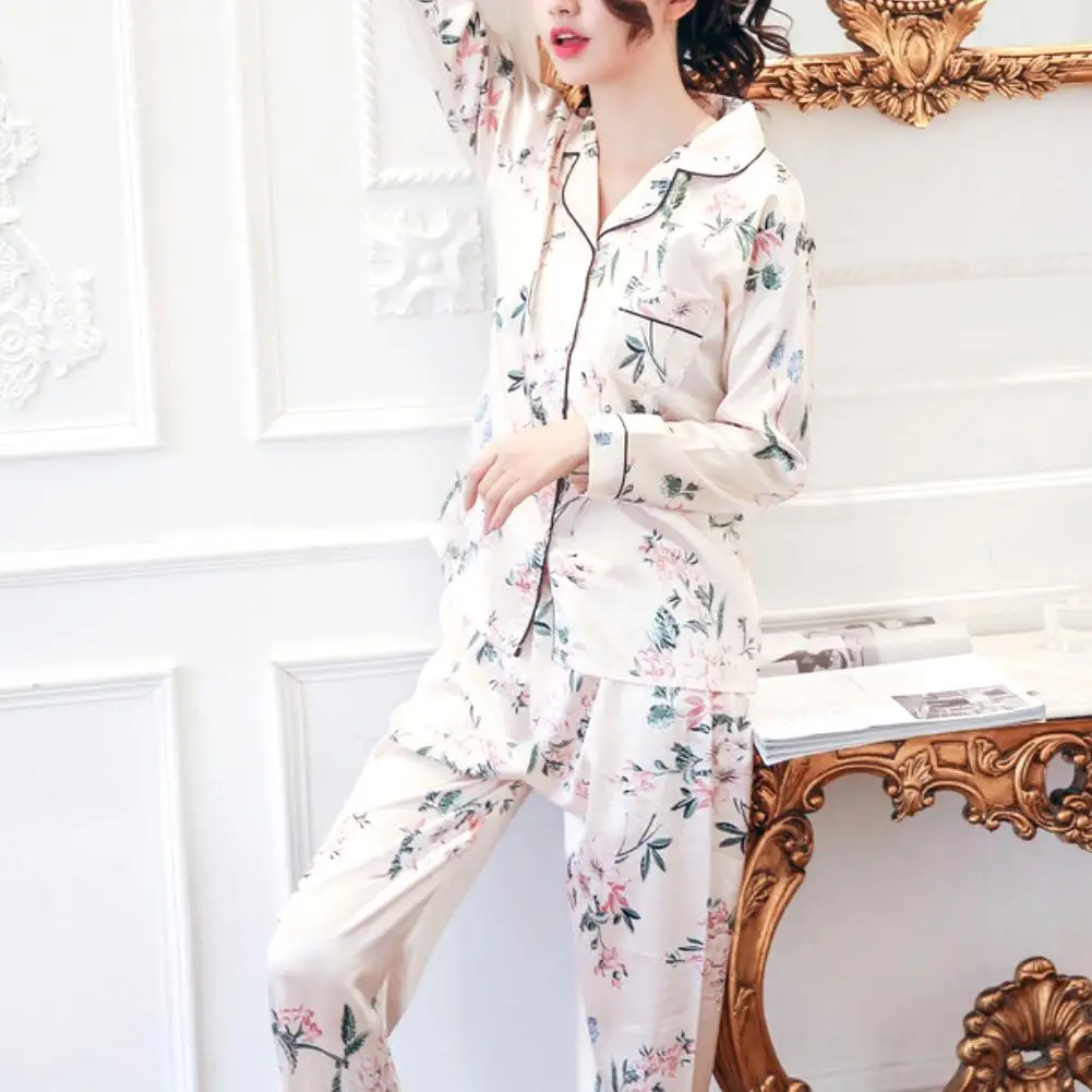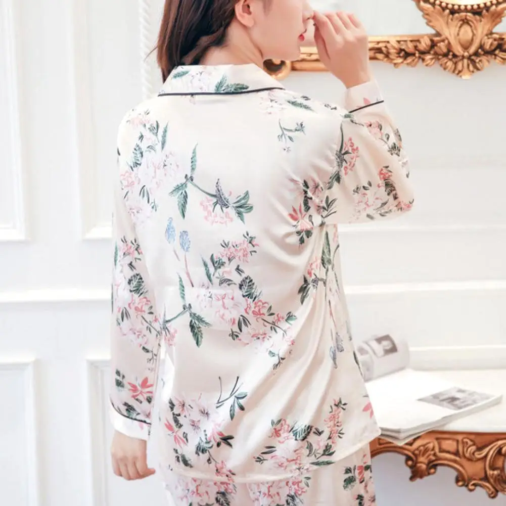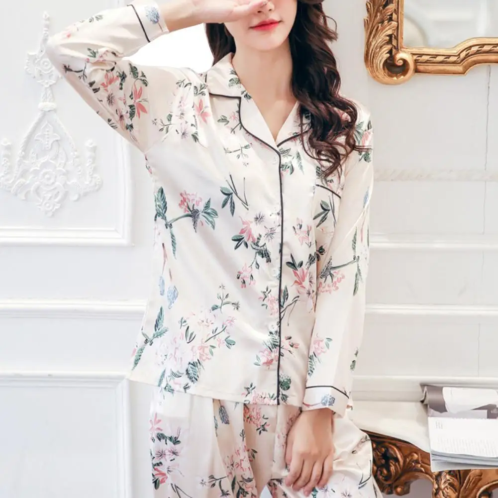 Весенняя женская пижама 2021 2 шт. Топ с длинным рукавом с цветочным принтом брюки Ночное белье из искусственного шелка пижамный комплект