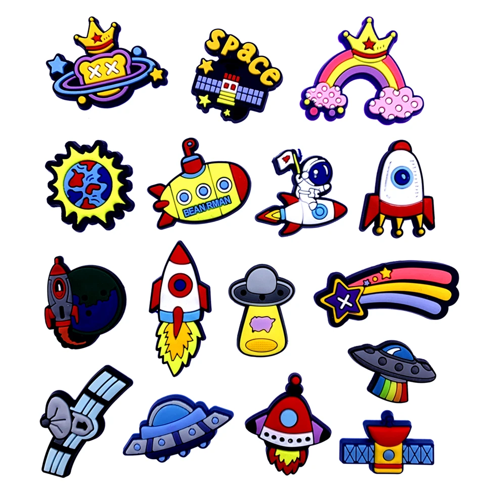 100 шт., оптовая продажа, смешанные Мультяшные космические серии, ПВХ аксессуары в виде тапочек с отверстиями, подвески для обуви астронавта, детские рождественские подарки, НЛО, Кроксы