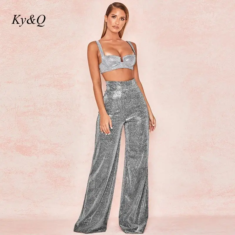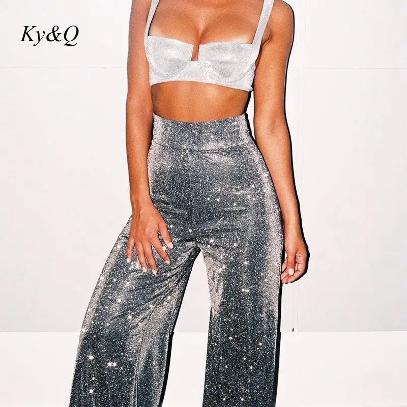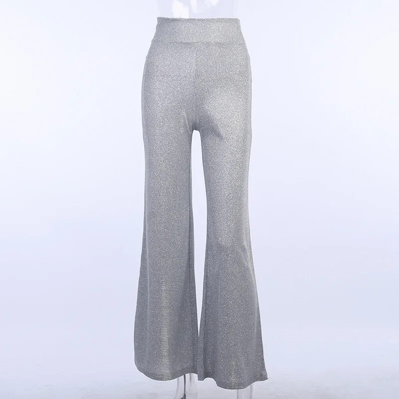 2021 серебряные блестящие широкие брюки с высокой талией и блестками, женские зимние брюки, пикантные повседневные штаны с колокольчиками, праздничная Клубная одежда