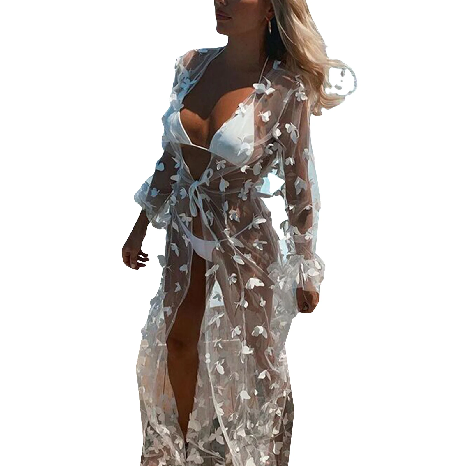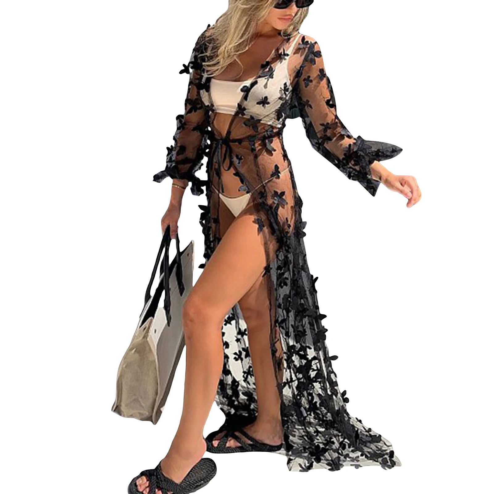 2021 новый женский длинный купальник накидка сексуальный открытый фронт 3D бабочка струящийся кимоно кардиган