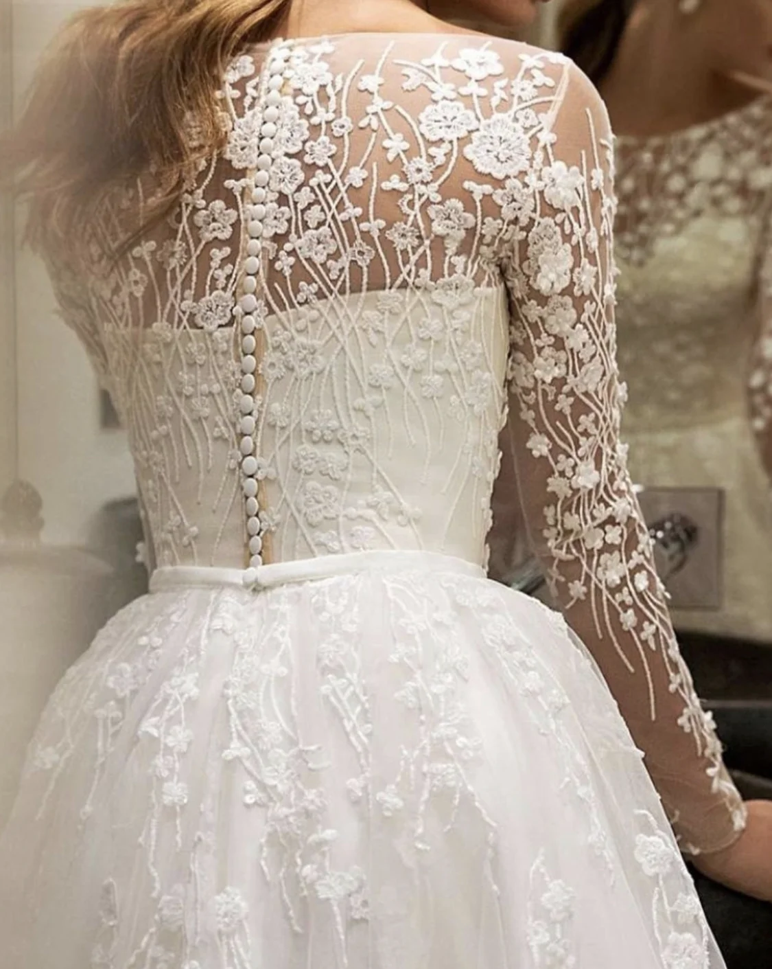 Свадебное платье-трапеция с круглым вырезом, длинным рукавом и кружевной аппликацией, из тюля, платье невесты до пола со шлейфом, 2022