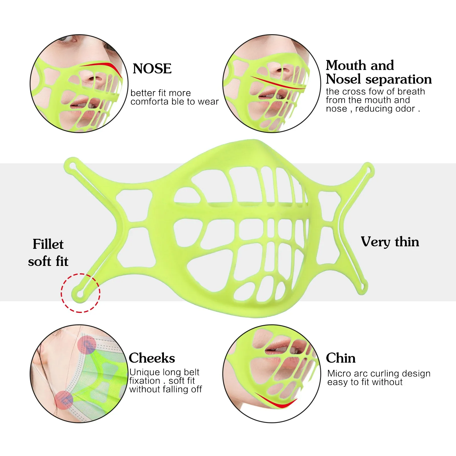 Кронштейн удерживает ткань вокруг рта, чтобы создать больше пространства. Защищает женский макияж, не прилипает губная помада.