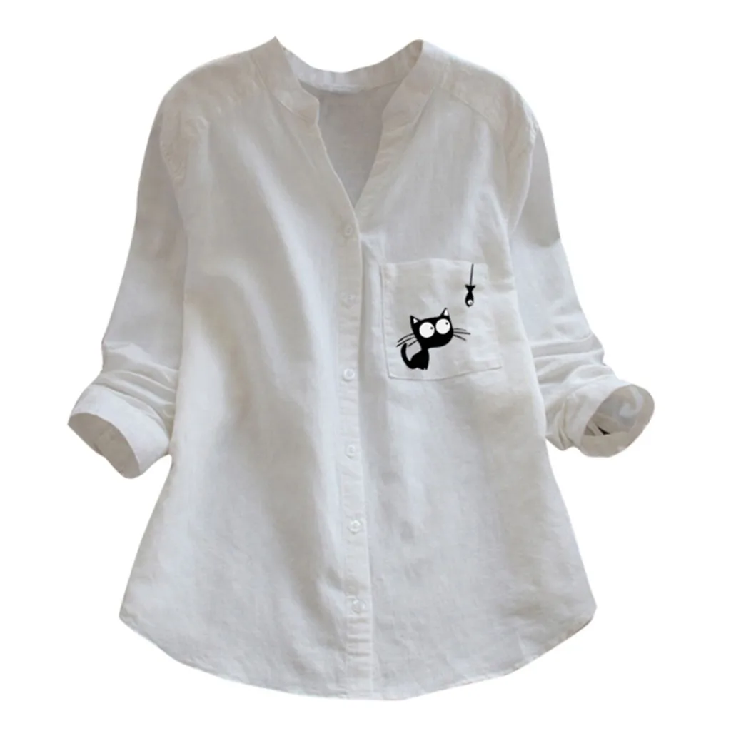 Блузка женская из хлопка и льна, с принтом кошек и длинным рукавом, 3xl, размера плюс