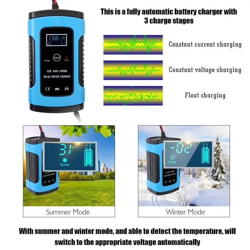 Автоматическое зарядное устройство 12 В 6 А для грузовиков, мотоциклов, автомобилей, полностью интеллектуальное импульсное зарядное устройство для ремонта автомобильных аккумуляторов
