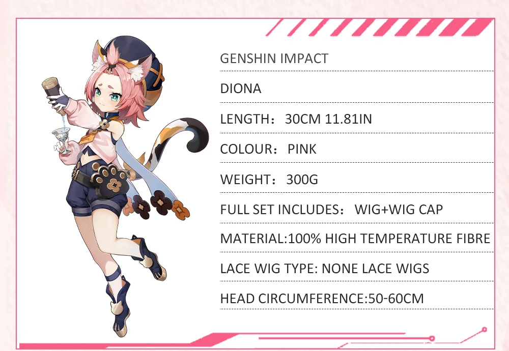 Anihutпарик для косплея Diona без ушей Genshin ударопрочный розовый термостойкий синтетический парик Diona для косплея на Хэллоуин
