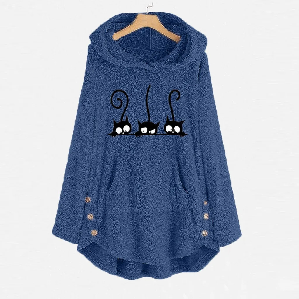 Худи женское флисовое в стиле оверсайз, теплый пуловер с капюшоном и принтом кота, свитшот, джемпер, Женская толстовка с капюшоном