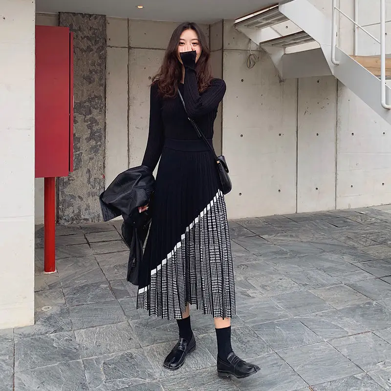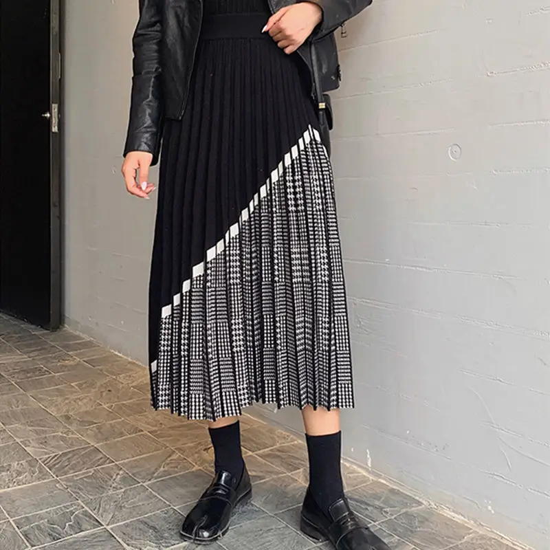Винтажная трикотажная Женская юбка в клетку, Осень-зима гофрированные длинные юбки, теплая трапециевидная юбка, женский свитер, юбки для женщин