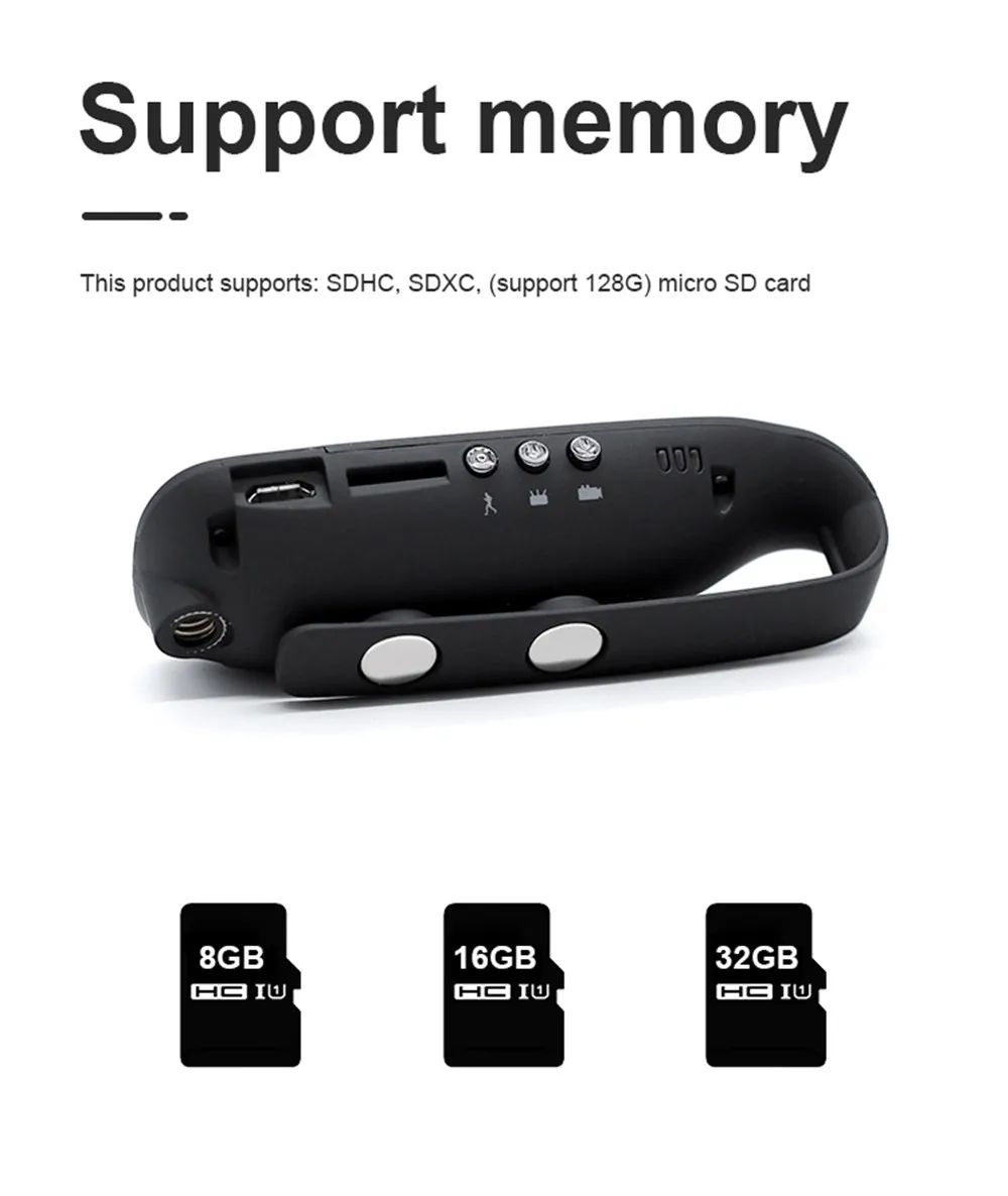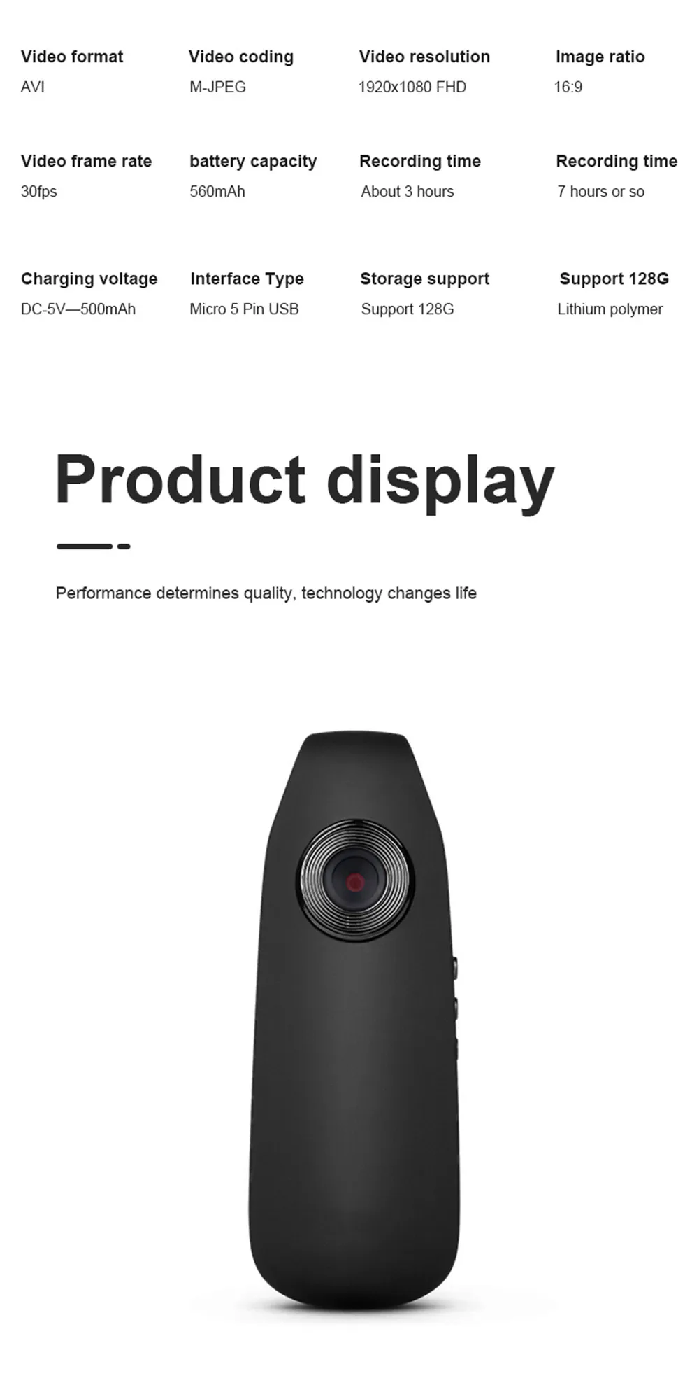 Особенности:1 высокое качество изображения2 импортные HD линзы3 компактный дизайн, портативный держатель DV4 Формат видео: 1280x720,1920x10805 Поддержка обнаружения движения6 высокоскоростной интерфейс передачи данных USB 2,0Поддержка карт micro SD 7 128 ГБ8 видеозаписей около 3 часов9 циклическая запись и запись видео во время зарядки поддерживаетсяПараметры:Формат видео: AVIКодирование видео: M-JPEGРазрешение видео: 1920x1080HDПропорция изображения: 16:9Частота кадров видео: 30fbsМедиаплеер: популярный видеоплеерПоддерживаемые системы: windows me/2000/xp/vista;mac os;Linux;Емкость аккумулятора: 560 мАчПродолжительность записи видео: около 3 часовПродолжительность записи аудио; Около 7 часовЗарядка: DC 5V--500MAHТип интерфейса: Micro 5Pin USBSuupport для хранения: SDHC или SDXC (поддержка 128 ГБ) micro SD картаТип батареи: высокомощная полимерная литиевая батарея