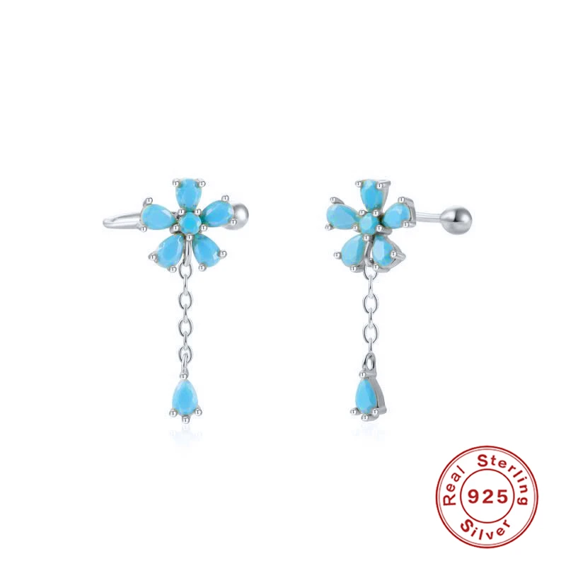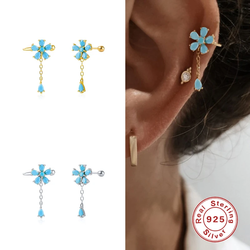 Женские серьги-каффы из серебра 925 пробы в богемном стиле с бирюзовым цветком и кулоном из синего циркония, ювелирные изделия