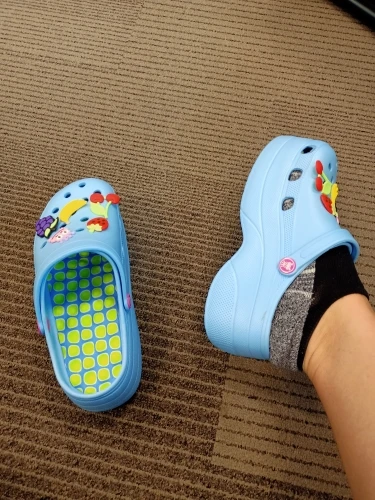 Классные копия кроксов, так как у кроксов нет вообще такой модели, решила заказать вот эти и не прогадала, они очень классные, легкие и необычные. Платформа не высокая, ходить удобно, подошва пупырчатая с массажным эффектом, на российский 37,37/5 заказала 39 все подошло идеально, так что берите на 2 размера больше. Пришли в хорошем состоянии с джиббитсами, спасибо за товар