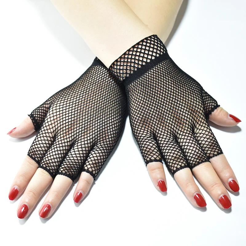 Перчатки короткие в сетку без пальцев, однотонные, черные, для вечевечерние танцевальных клубов, нейлоновые, из спандекса