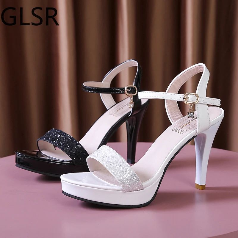 Босоножки женские блестящие на платформе и высоком каблуке, с ремешком на щиколотке