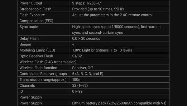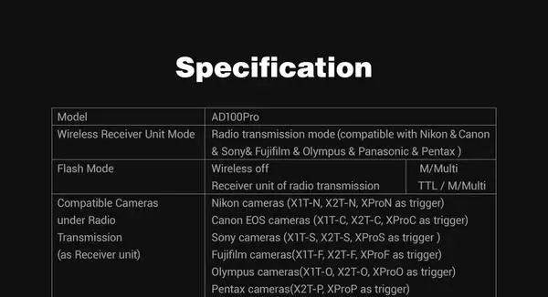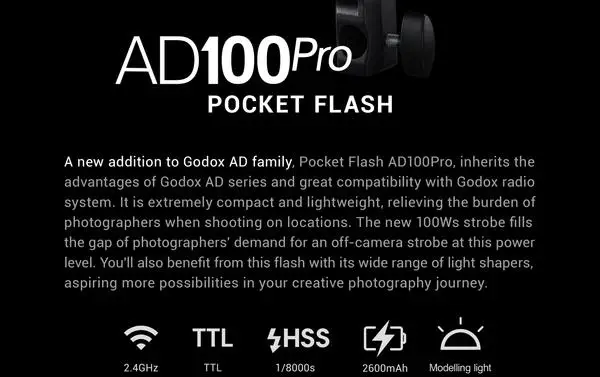 AD100pro обладает впечатляющими основными функциями, такими как 100 Вт мощности, регулируемой за девять шагов от 1/256 до 1/1, время переработки от 0,01 до 1,5 секунд и короткие длительности вспышки. AD100pro обладает ручными, автоматическими и стробоскопическими возможностями. Ручной режим выводит пользователю выбор мощности, моделисветильник и синхронизации первого или второго занавесок. Многорежимный контроль стробоскопической скорости до 90 раз (90 Гц). Дополнительные беспроводные передатчики с 32-канальным и четырехгрупповым режимом управления системой вспышки, синхронизацией первого и второго занавесок, высокоскоростной синхронизацией до 1/8000 секунды, уровнем мощности, И моделирующая лампа на расстояниях до 328 '. Обновления прошивки доступны на сайте Godox.