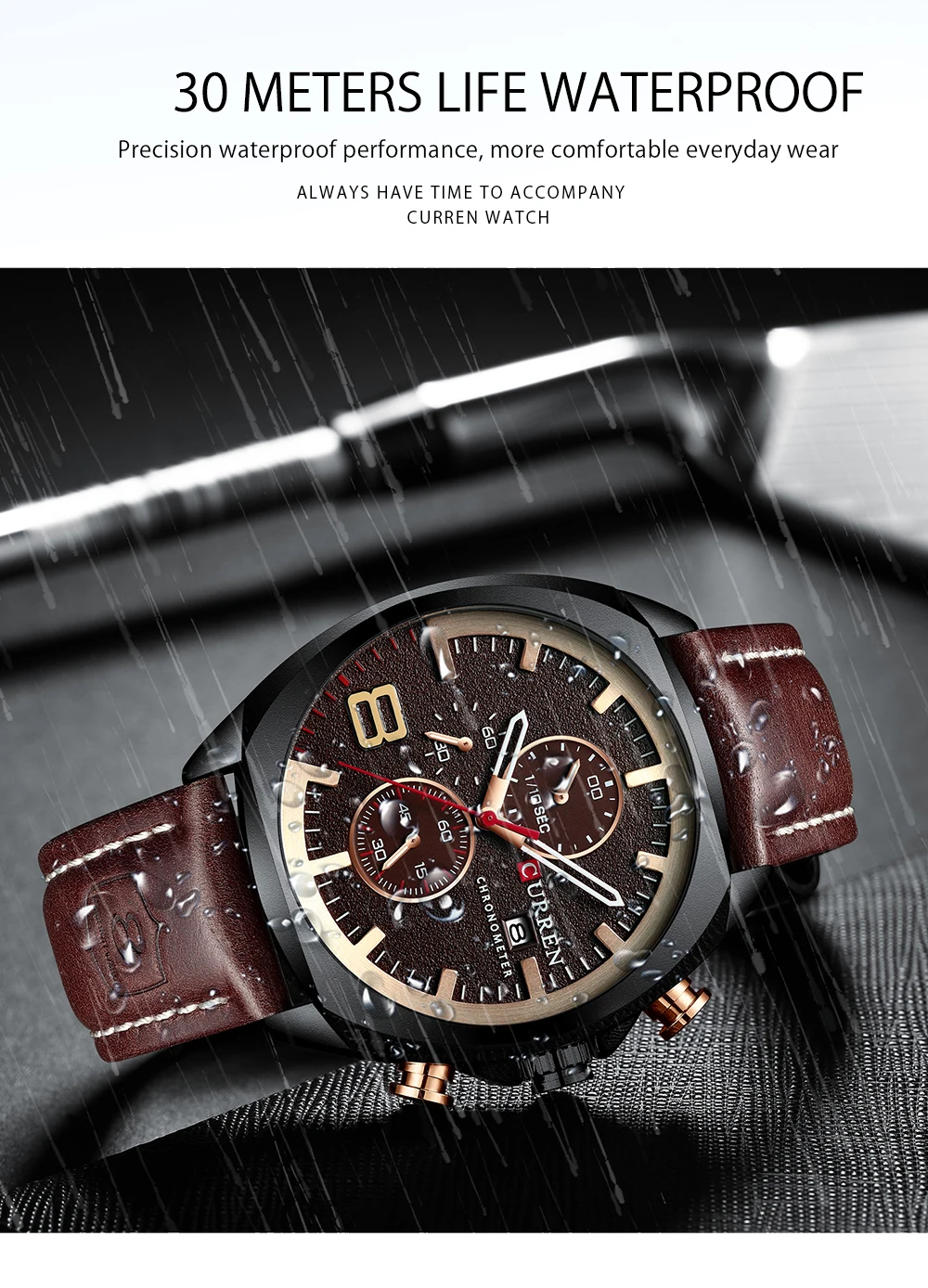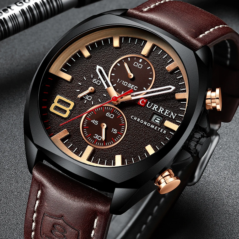 CURREN Мужские часы водонепроницаемые спортивные военные часы для мужчин многофункциональный хронограф Модные кварцевые наручные часы кожаный ремешок