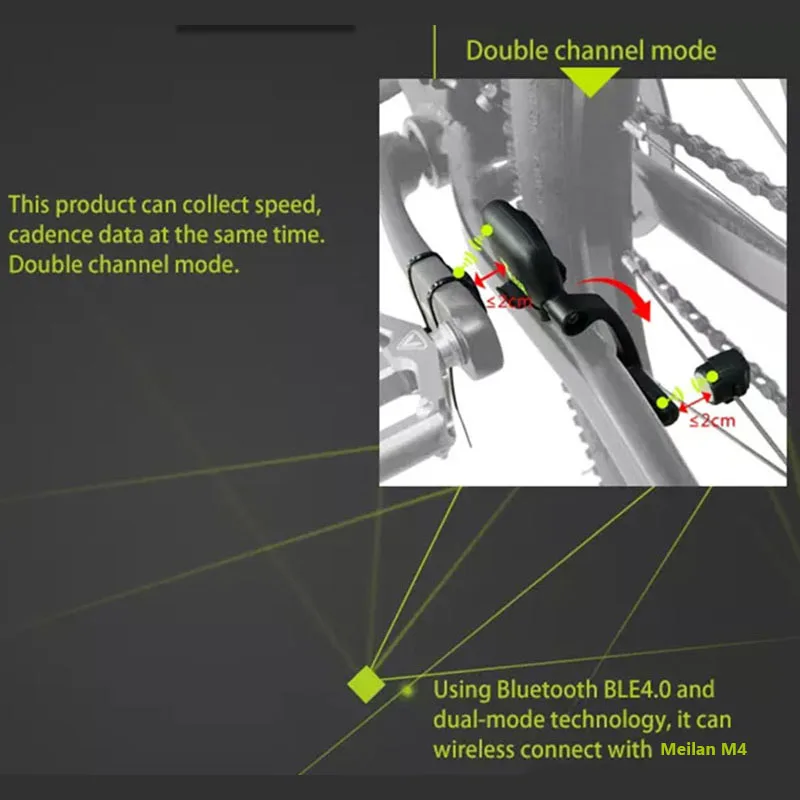 * Беспроводное соединение с приложением для верховой езды и передача даты, на данный момент он поддерживает такие международные бренды, как Wahoo, Cateye, Topeak,Teasi,Komoot,Galk,Meilan и т. д. ** С помощью геомагнитной технологии, алгоритма интеллектуального программного обеспечения, автоматического датчика колеса или педали вращения раз. *** Используя технологию Bluetooth BLE4.0 и ANT + dual-mode, он может беспроводно соединяться с велокомпьютером, что соответствует стандартному протоколу Bluetooth. Устройство имеет быструю кнопку, вы можете быстро выбрать режим скорости или частоты вращения педалей, и есть две светодиодный ные инструкции, соответствующие различным условиям работы.