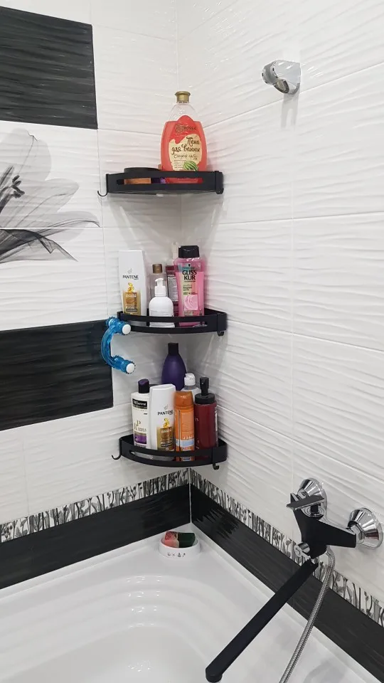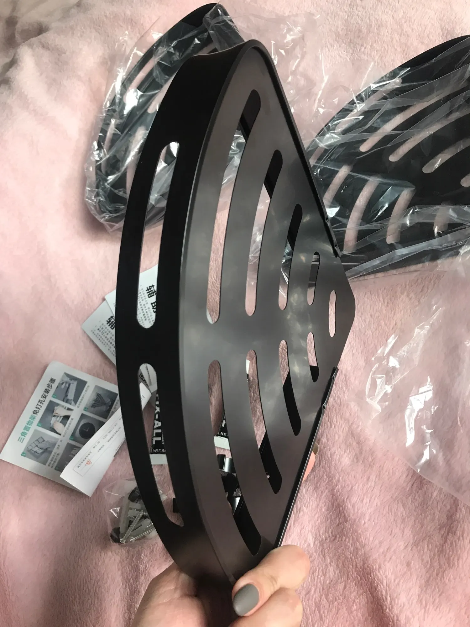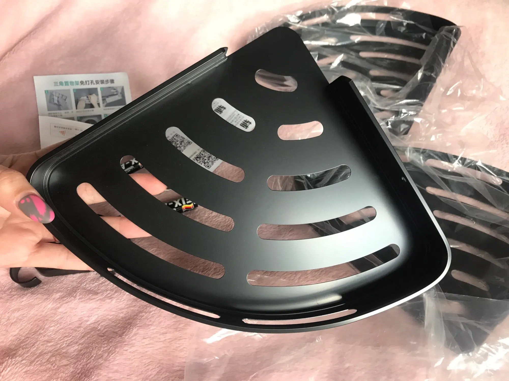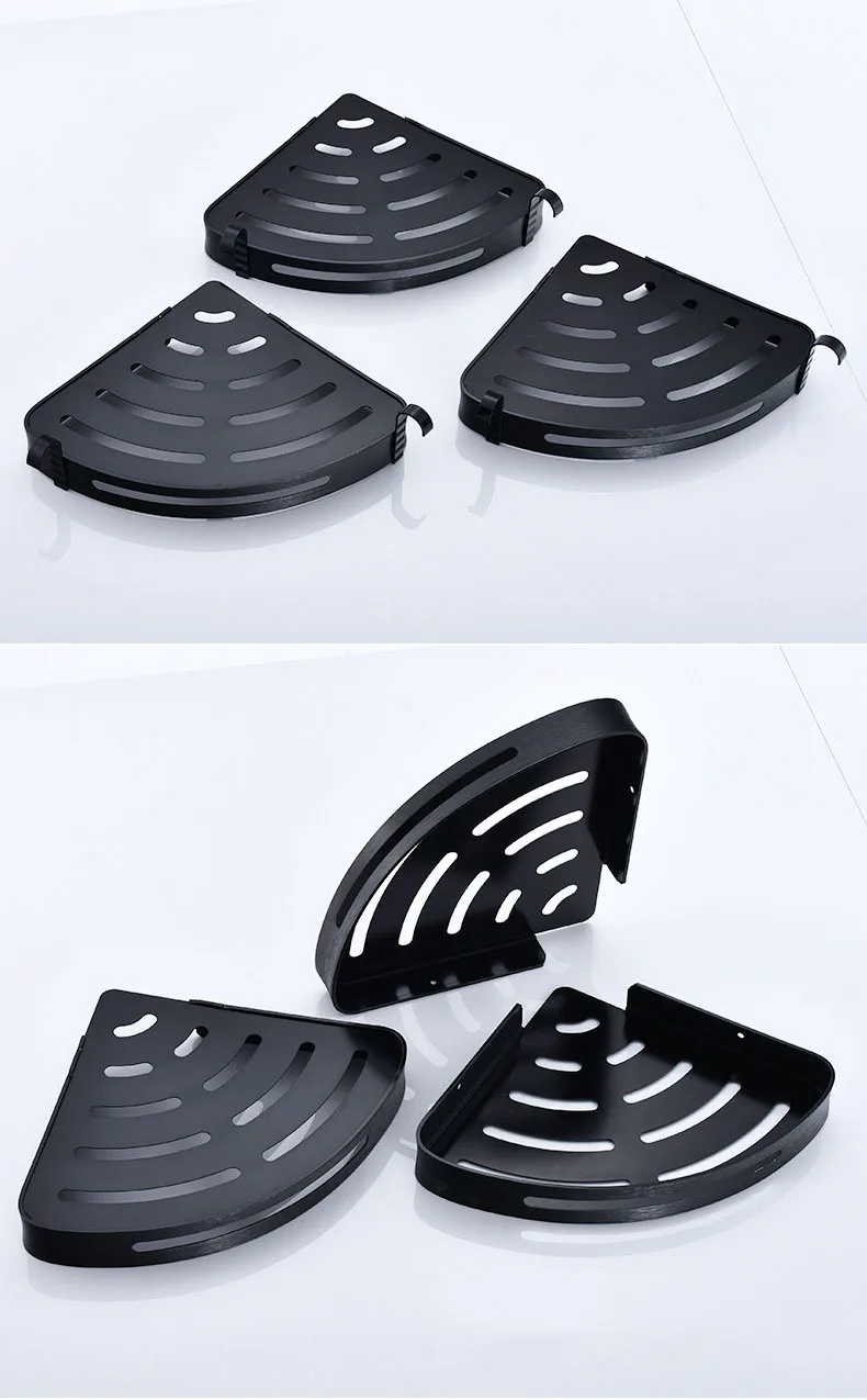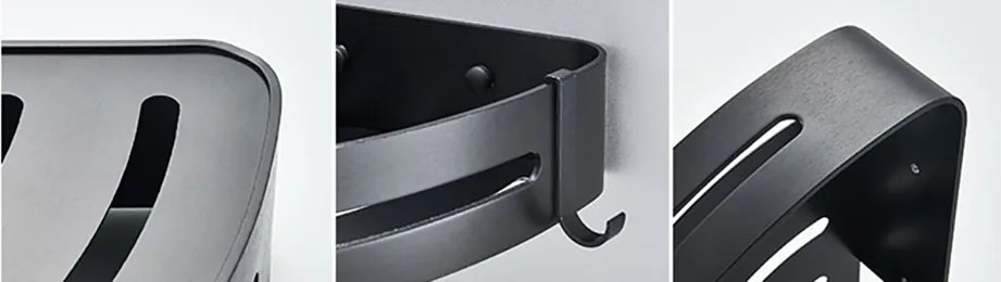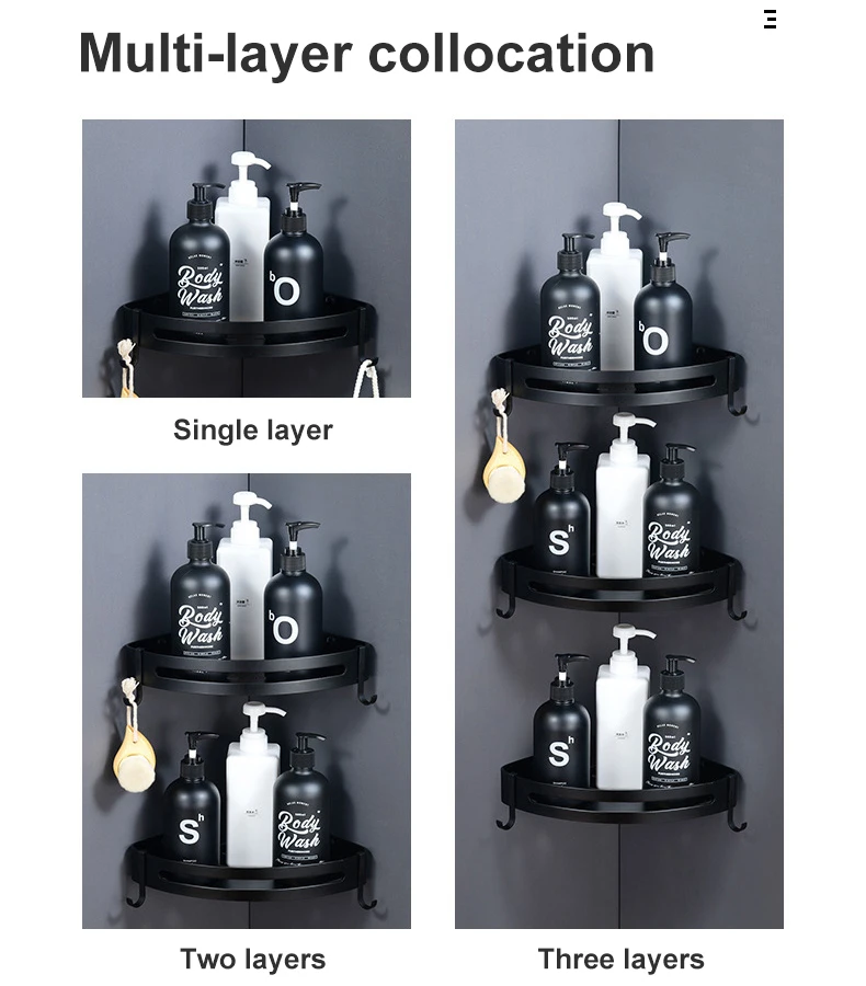 Это практичная полка с черными внешними и съемными крючками. Он стильный и универсальный. Он может быть установлен в углу и может сэкономить больше места. Этот дизайн только для того, чтобы обеспечить больше удобства для пользователей. Его можно использовать во многих местах, таких как кухни, ванные комнаты, туалеты, проходы, балконы, раковины и т. д.-Это может сэкономить более 80% пространства.