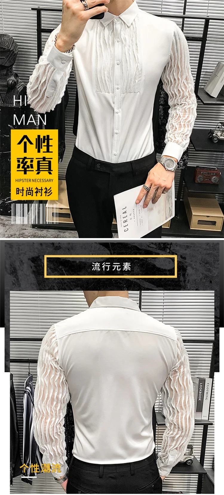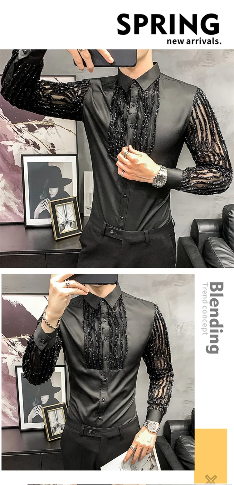 Кружевные Полые рубашки для мужчин с длинным рукавом, облегающие уличные вечерние Блузы для ночного клуба, певицы, одежда для ди-джеев, Camisas Para Hombre