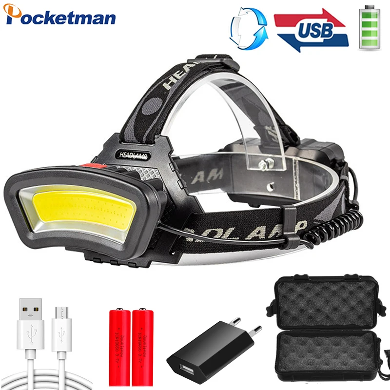 Сильный Мощность USB Перезаряжаемые фары Применение 18650 Батарея Водонепроницаемый COB светодиодный головной светильник красный светильник Предупреждение светильник головкой спереди светильник