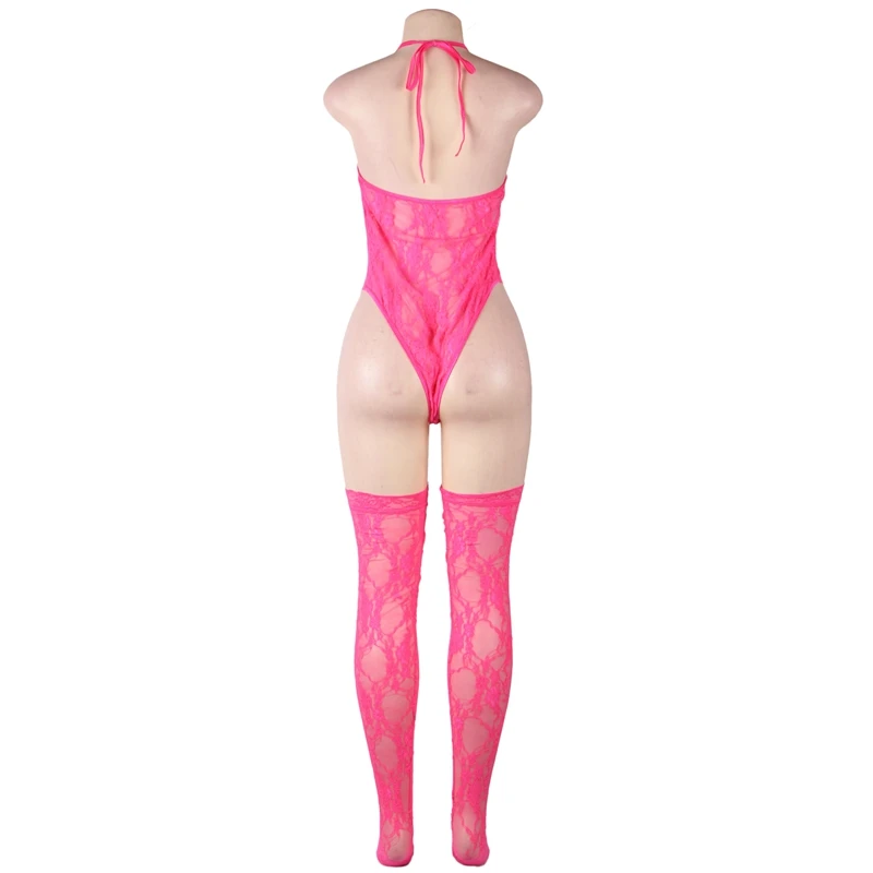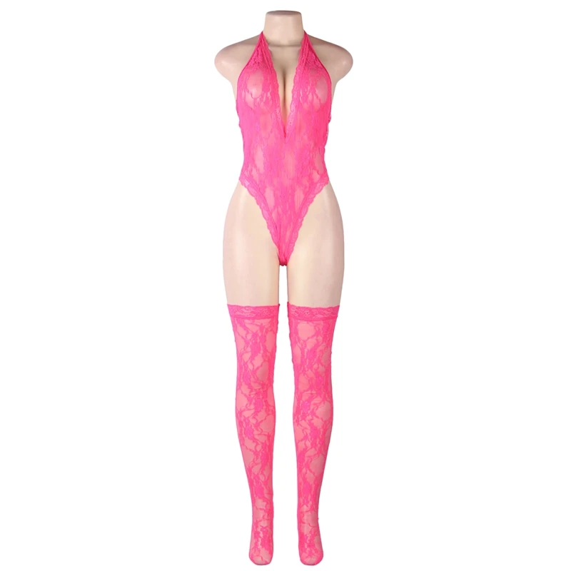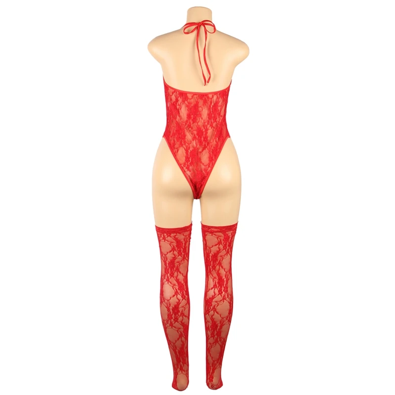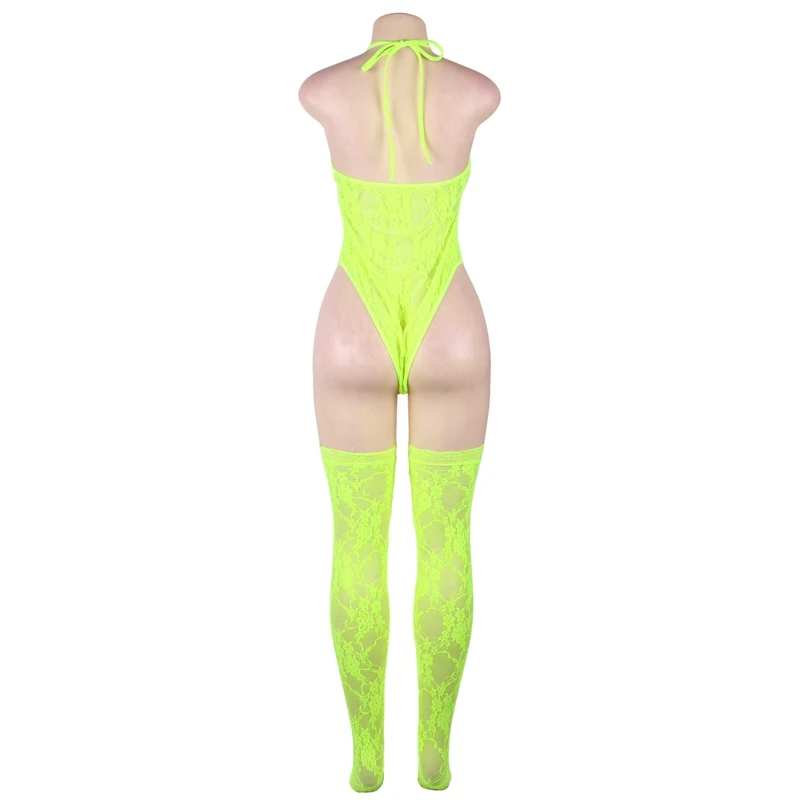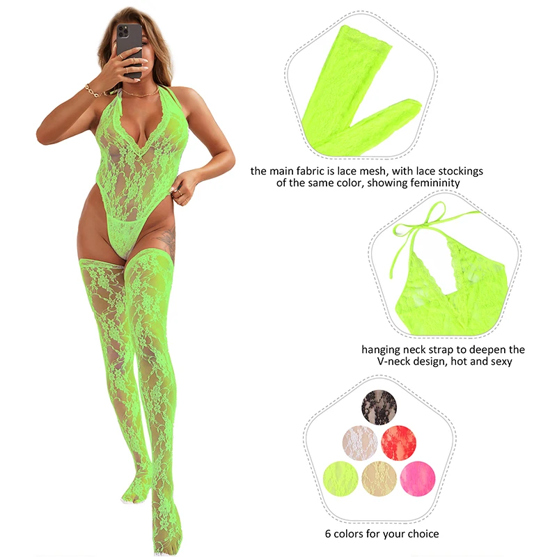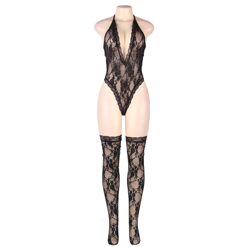 Женское Кружевное боди с глубоким V-образным вырезом и носками, прозрачное сексуальное нижнее белье RI81021